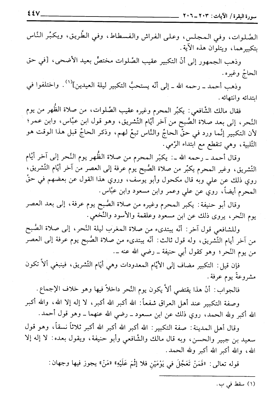 فقال مالك الشَّافعي: يكبِّر المحرم وغيره عقيب الصَّلوات، من صلاة الظُّهر من يوم النَّحر، إلى بعد صلاة الصُّبح من آخر أيَّام التَّشريق، وهو قول ابن عبَّاس، وابن عمر؛ لأن التكبير إنَّما ورد في حقِّ الحاجِّ والنَّاس تبعٌ لهم، وذكر الحاجِّ قبل هذا الوقت هو التَّلبية، وهي تنقطع مع ابتداء الرَّمي.