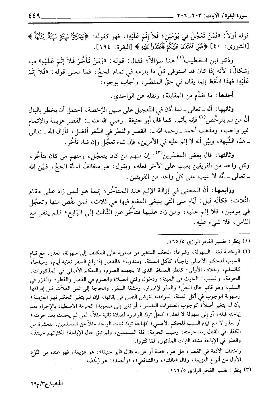 ورابعها: أنّ المعنى في إزالة الإثم عند المتأخِّر؛ إنما هو لمن زاد على مقام الثَّلاث؛ فكأنّه قيل: أيَّام منى التي ينبغي المقام فيها هي ثلاث، فمن نقَّص منها وتعجَّل في يومين، فلا إثم عليه، ومن زاد عليها فتأخَّر عن الثَّالث إلى الرَّابع؛ فلم ينفر مع النَّاس، فلا شيء عليه.