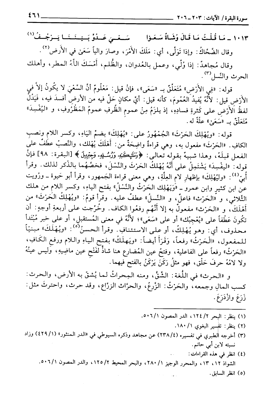 قوله: «وَيُهْلِكَ الحَرْثَ» الجُمْهُورُ على: «يُهْلِكَ» بضمِّ اليَاءِ، وكسر اللام ونصب الكافِ. «الحَرْثَ» مفعول به، وهي قراءةٌ واضِحَةٌ من: أَهْلَكَ يُهْلك، والنَّصبُ عطَفٌ على الفعل قبلُهُ، وهذا شبيهٌ بقوله تعالى: {وَرُسُلِهِ وَجِبْرِيلَ} [البقرة: 98] فإنَّ قوله: «ليفْسِدَ» يَشْتَمِلُ على أَنَّهُ يُهْلَكُ الحَرْثَ والنَّسْلَ، فخصَّهُما بالذّكر لذلك. وقرأ أُبيّ: «وليُهْلِكَ» بإظهارِ لام العِلَّةِ، وهي معنى قراءة الجَمهور، وقرأ أبو حَيوة - ورُويت عن ابن كثيرٍ وابن عمرو - «وَيَهْلِك الحَرْثُ والنَّسْلُ» بفتح الياءِ، وكسر اللام من هلك الثَّلاثي، و «الحَرْث» فاعلٌ، و «النَّسلُ» عطفٌ عليه. وقرأ قومٌ: «ويُهْلِكُ الحَرْثَ» من أَهْلَكَ، و «الحَرْث» مفعولٌ به إلا أَنَّهُم رفعُوا الكاف. وخُرِّجت على أربعةِ أوجهٍ: أن تكُونَ عَطْفاً على «يُعْجِبُك» أو على «سَعَى» ؛ لأَنَّهُ في معنى المُستقبل، أو على خبر مُبْتَدأ للمفعول، «الْحَرْثُ» رفعاً، وَقَرَأَ أيضاً: «ويَهَلكُ» بفتح الياءِ واللام ورفعِِ الكَافِ، «الحَرْثُ» رفعا على الفاعلية، وفتحُ عين المُضارع هنا شاذٌّ لفَتْحٍ عين ماضِيهِ، وَليس عينُهُ ولا لامُهُ حرفَ حَلْق، فهو مثلُ رَكَنَ يَرْكَنُ بالفتح فيهما.