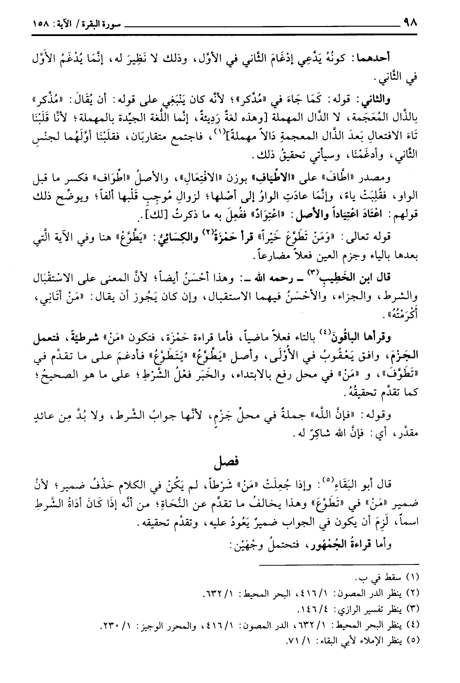 وقراها الباقُونَ بالتاء فعلاً ماضياً، فأما قراة حَمْزَة، فتكون «مَنْ» شرطيَّةً، فتعمل الجَزْمَ، وافق يَعْقُوبُ في الأُوْلَى، وأصل «يَطَّوَّعُ» «يَتَطَوَّعُ» فأدغمَ على ما تقدَّم في «تَطَوَّفَ» ، و «مَنْ» في محل رفع بالابتداء، والخَبَر فعْلُ الشَّرْطِ؛ على ما هو الصحيح كما تقدَّم تحقيقُهُ.