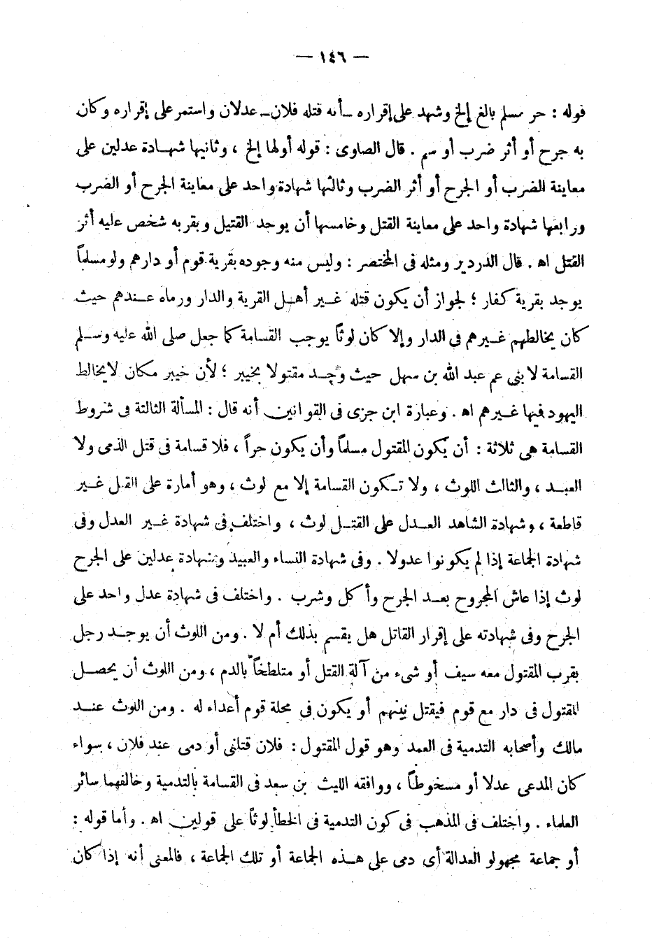 قوله: حر مسلم بالغ إلخ وشهد على إقراره - أنه قتله فلان - عدلان واستمر على إقراره وكان به جرح أو أثر ضرب أو سمّ. قال الصاوي: قوله أولها إلخ، وثانيها: شهادة عدلين على معاينة الضرب أو الجرح أو أثر الضرب، وثالثها: شهادة واحد على معاينة الجرح أو الضرب، ورابعها: شهادة واحد على معاينة القتل، وخامسها: أن يوجد القتيل وبقربه شخص عليه أثر القتل أهـ. قال الدردير ومثله في المختصر: وليس منه وجوده بقرية قوم أو دارهم ولو مسلمًا يوجد بقرية كفّار؛ لجواز أن يكون قتله غير أهل القرية والدار ورماه عندهم حيث كان يخالطهم غيرهم في الدار وإلاَّ كان لوثًا يوجب القسَامة كما جعل صلى الله عليه وسلم القسَامة لا بنَيْ عمْ عَبد الله بن سهل حيث وجد مقتولاً بخيبر؛ لأن خيبر مكان لا يخالط اليهود فيها غيرهم اهـ. وعبارة ابن جزي في القوانين أنه قال: المسألة الثالثة في شروط القسامة هي ثلاث: أن يكون المقتول مسلمصا وأن يكون حرًا، فلا قسامة في قتل الذمي ولا العبد، والثالث اللوث، ولا تكون القسامة إلا مع لوث، وهو أمارة على القتل غير قاطعة، وشهادة الشاهد العدل على القتل لوث، واختلف في شهادة غير العدل وفي شهادة الجماعة إذا لم يكونوا عُدُولاً. وفي شهادة النساء والعبيد وشهادة عدلين على الجرح لوث إذا عاش المجروح بعد الجرح وأكَلَ وشَرِبَ. واختلف في شهادة عدل واحد على الجرح وفي شهادته على إقرار القاتل هي يُقسم بذلك أم لا. ومن اللوث أن يوجد رجل بقرب المقتول معه سيف أو شيئ من آلة القتل أو متلطخًا بالدم، ومن اللوث أن يحصل المقتول في داره مع قوم فيقتل بينهم أو يكون في محله قوم أعداء له. ومن اللوث عند مالك وأصحابه التدمية في العمد وهو قول المقتول: فلان قتلني أو دَمِي عند فلان، سواء كان المدعي عدلاً أو مسخوطًا، ووافقه الليث بن سعد في القَسَامة بالتدمية وخالفهما سائر العلماء. واختلف في المذهب في كون التدمية في الخطأ لوثًا على قولين اهـ. وأما قوله: أو جماعة مجهولو العدالة أي دمي على هذه الجماعة أو تلك الجماعة، فالمعنى أنه إذا كان