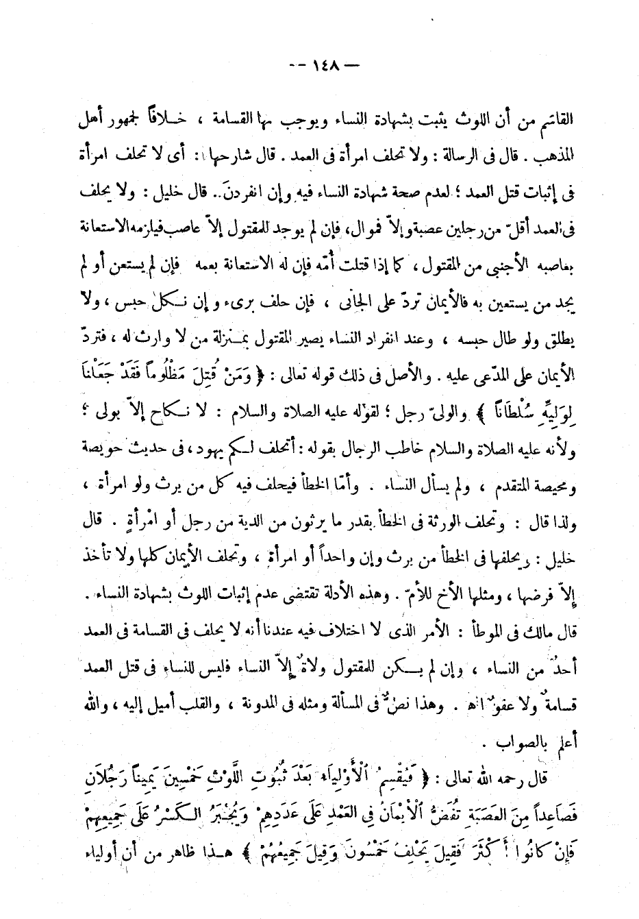 القاسم من أن اللوث يثبت بشهادة النساء ويوجب بها القسامة، خلافًا لجمهور أهل المذهب. قال في الرسالة: ولا تحلف امرأة في العمد. قال شارحها: أي لا تحلف امراة في إثبات قتل العمد؛ لعدم صحة شهادة النساء فيه وإن انفردن. قال خليل: ولا يحلف في العمد أقل من رجلين عصبة وإلا فموالٍ، فإن لم يوجد للمقتول إلا عاصب فيلزمه الاستعانة بعاصبه الأجنبي من المقتول، كما إذا ثُتِلَتْ أُمّه فإن له الاستعانة بعمه فإن لم يستعن أو لم يجد من يستعين به فالأيمان تُرَدُّ على الجاني، فإن حَلَفَ بَرِئ وإ، نَكَلَ حُبِس، ولا يطلق ولو طال حَبْسُه، وعند انفراد النساء يصير المقتول بمنزلة مَنْ لا وارث له، فتُرَدُّ الأيمان على المدّعى عليه. والأصل في ذلك قوله تعالى: وَمَن قُتِلَ مَظلوُمَا فقَد جَعَلنا لِوَلِيِهِ سُلطَنًا" [الإسراء: 33] والوليّ رجل؛ لقوله علهي الصلاة والسلام: "لا نكاح إلا بولي" ولأنه عليه الصلاة والسلام خاطب الرجال بقوله: "أتحلف لكم يهود" في حديث حويصة ومحيصة المتقدم، ولم يسأل النساء. وأما الخطأ فيحلف فيه كل مَنْ يَرِثُ ولو امرأة، ولذا قال: وتحلف الورثة في الخطأ بقدر ما يرثون من الدية من رجل أوامرأة. قال خليل: ويحلفها في الخطأ من يرث وإن واحدًا أو امرأة.
