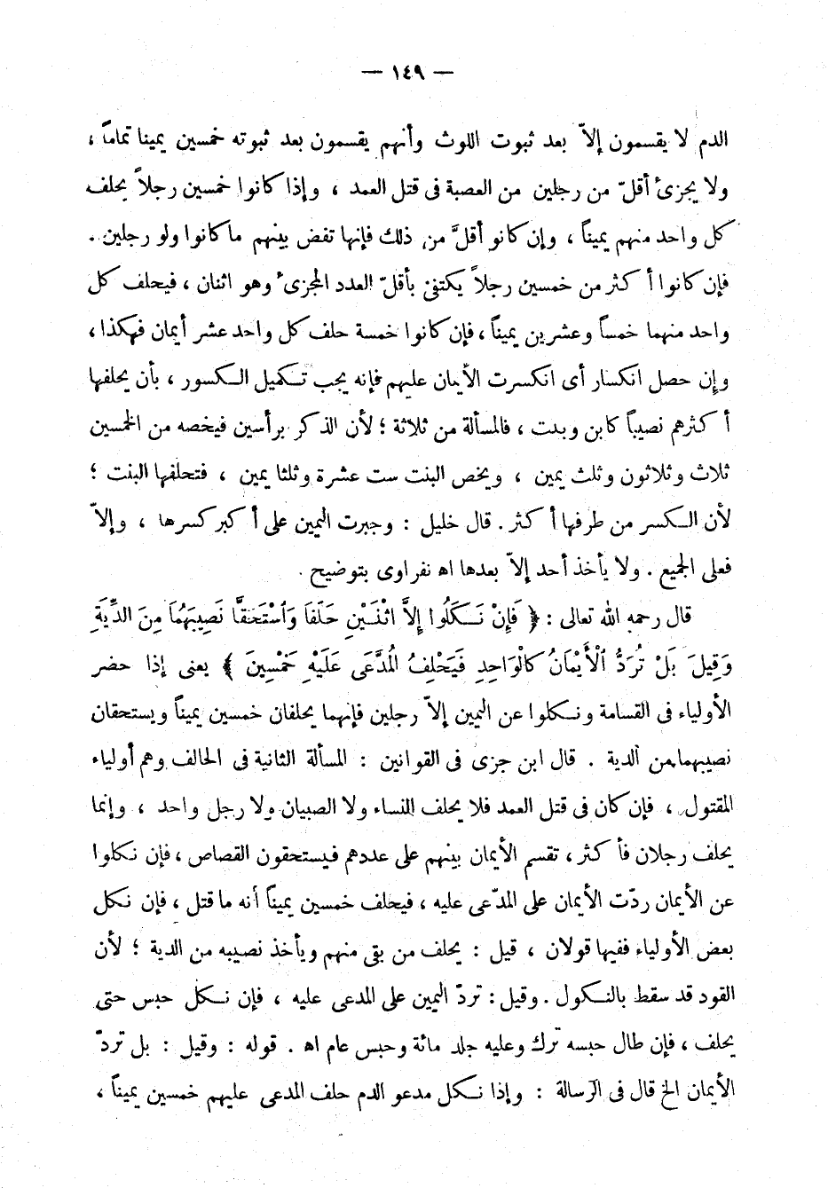 الدم لا يقسمون إلا بعد ثبوت اللوث وأنهم يقسمون بعد ثبوته خمسين يمينًا تمامًا، ولا يجزئ أقل من رجلين من العصبة في قتل العمد، وإذا كانوا خمسين رجلاً يحلف كل واحد منهم يمينًا، وإن كانوا أقل من ذلك فإنها تفض بينهم ما كانوا ولو رجلين. فإن كانوا أكثر من خمسين رجلاً يكتفي بأقل العدد المجزئ وهو اثنان، فيحلف كل واحد منهما خمسًا وعشرين يمينًا، فإن كانوا خمسة حلف كل واحد عشر أيمان فهكذا، وإن حصل انكسار أي انكسرت الأيمان عليهم فإنه يجب تكميل الكسور، بأن يحلفها أكثرهم نصيبًا كابن وبنت، فالمسألة من ثلاثة؛ لأن الذكر برأسين فيخُّصه من الخمسين ثلاث وثلاثون وثُلُث يمين، ويخص البنت ستُّ عشرة وثُلُثًا يمين، فتحلفها البنت؛ لأن الكسر من طرفها أكثر. قال خليل: وجُبِرَتِ اليمين على أكبر كَسَرها، وإلاَّ فعلى الجميع. ولا يأخذ أحد إلاَّ بعدها اهـ النفراوي بتوضيح.