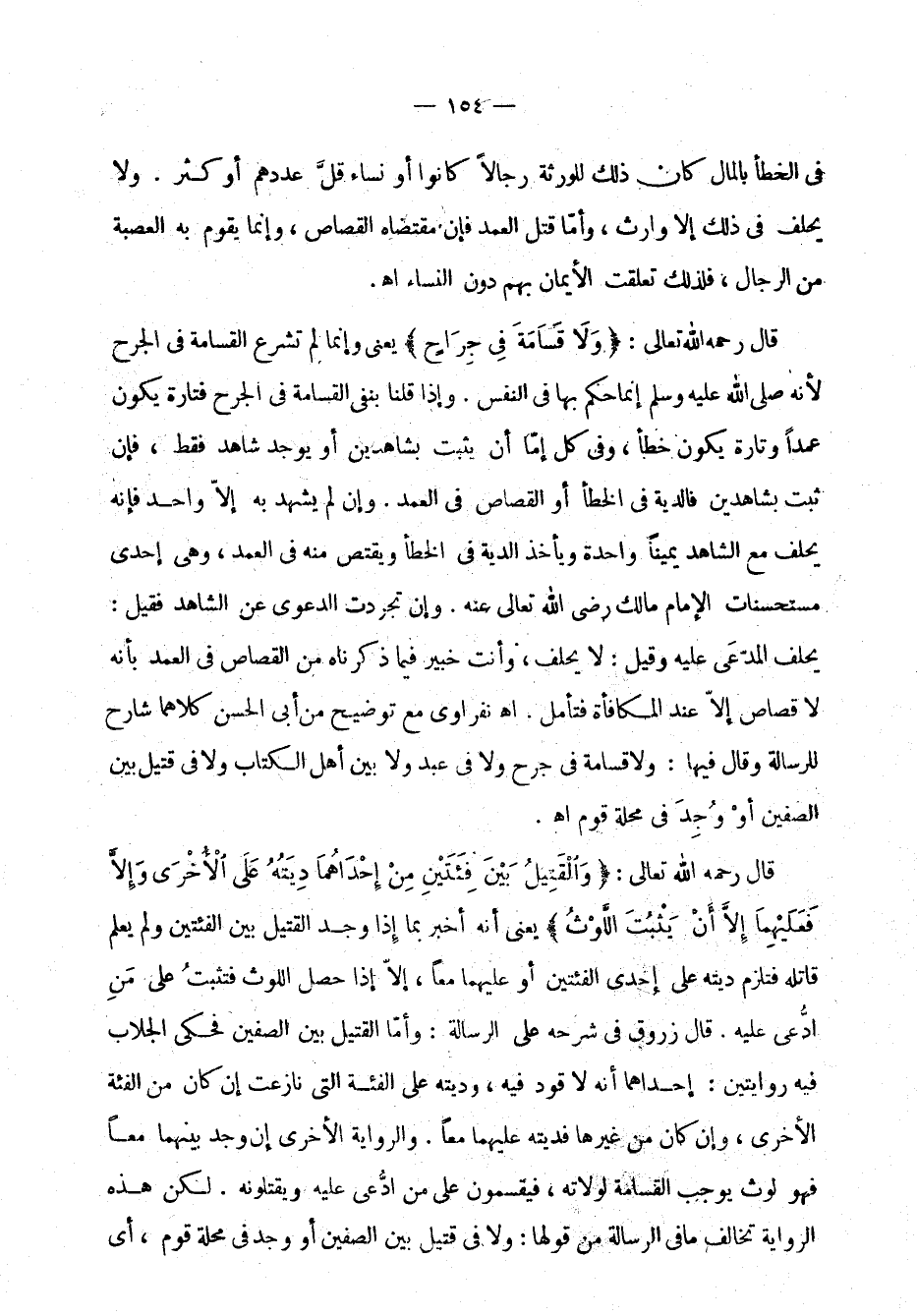 قال رحمه الله تعالى: "ولا قَسَامَةَ فِي جِرَاح" يعني ,غنما لم تشرع القَسَامة في الجرح لأنه صلى الله عليه وسلم إنما حَكَمَ بها فيالنفس. وإذا قُلْنا بنَفْي القَسَامة في الجرح فتارة يكون عَمْدًا وتارة يكون خطأ، وفي كل إما إن يثبت بشاهدَيْن أو يوجد شاهد فقط، فإن ثبت بشاهدين فالديَة في الخطأ أو القصاص في العَمْد. وإن لم يشهد به إلاَّ واحد فإنه يَحْلِفُ مع الشاهد يمينًا واحدة ويأخذه الدَّيَة ي الخطأ ويقتصُّ منه في العَمْد، وهي إحد مستحسنات الإمام مالك رضي الله عنه. وإن تجرَّدت الدعوى عن الشاهد فقيل: يَحْلِفُ المدَّعَى عليه وقيل: لا يَحْلِفُ، وأنت خبير فيما ذكرناه من القصاص في العَمْد شارح للرسالة وقال فيها: ولا قَسَامة في جرح ولا في عَبْدٍ ولا بين أهل الكتاب ولا في قتيل بين الصفَّيْن أوْ وُجِدَ في محلة قوم اهـ.
