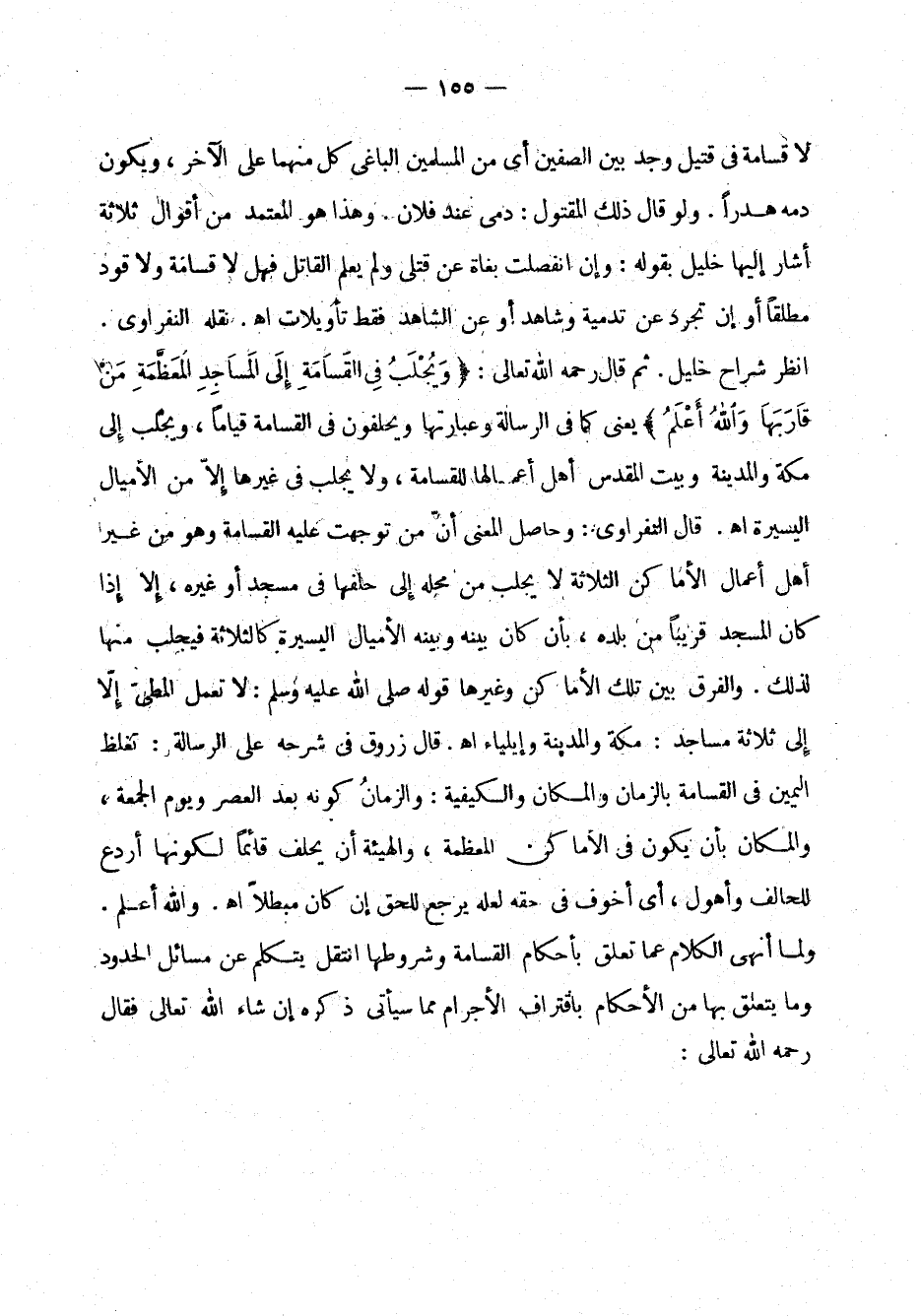 لا قَسَامة في قتيل وُجِدَ بني الصفين أي من المسلمين الباغي كل منهما على الآخرن ويكون دَمُه هَدْرًا. ولو قال ذلك المقتول: دَمِي عند فلان. وهذا هو المعتمد من أقوال ثلاثة أشار إليهاخليل بقوله: وإن انفصلت بغاة عن قتلى ولم يُعْلَم القاتل فهل لا قَسَامة ولا قَودَ مطلقًا وإن تجرَّد عن تدمية وشاهد أو عن الشاهد فقطَ تأويلات اهـ. نَقَلَه النفراوي. انظر شرح خليل. ثم قال رحمه الله تعالى: "وَيُجْلَبُ فِي القَسَامَةِ إِلَى المَسِاجِدِ المعَظَّمَةِ مَنْ قَارَبَها وَاللَّه أَعْلَمُ" يعني كما في الرسالة وعبارتها ويحلفون في القَسَامة قِيامًا، ويُجْلَبُ إلى مكة والمدينة وبيت المقدس أهل أعماله للقسامة، ولا يُجْلَبُ في غيرها إلاّ من الأميال اليسيرة اهـ. قال النفراوي: وحاصل المعنى أنّ مَنْ توجَّهت عليه القَسَامة وهو من غير أهل أعمال الأماكن الثلاثة لا يُجْلَبُ من محلّه إِلى حلْفِها في مسجد أو غيره، إلاَّ إِذا كان لمسجد قريبًا من بلده، بأن كان بينه وبينه الأميال اليسيرة كلاثلاثة فيُجْلَبُ منها لذلك. والفرق بين تلك الأماكن وغيرها قوله صلى الله عليه وسلم: "لا تعمل المطيّ إلاَّ إلى ثلاثة مساجد: مكة والمدينة وإيلياء" اهـ. قال زروق في شرحه على الرسالة: تُغَلَّظ اليمين في القَسَامة بالزمان والمكان والكيفية: والزمانُ كونه بعد العصر ويوم الجمعة، والمكان بأن يكون في الأمكان المعظَّمة، والهيئة أن يَحْلِفَ قائمًا لكونهاأردع للحالف وأهول، أي أخْوَف في حقَّه لعلّه يرجع للحقَّ إنكان مبطلاً اهـ. واللَّه أعْلَم. ولمَّا أنهى الكلام على ما تعلَّق بأحكام القَسَامة وشروطها انتقل يتكلم على مسائل الحدود وما يتعلَّ بها من الأحكام باقتراف الأجرام ممَّا سيأتي ذِكْرُه إن شاء الله تعالى فقال رحمه الله تعالى: