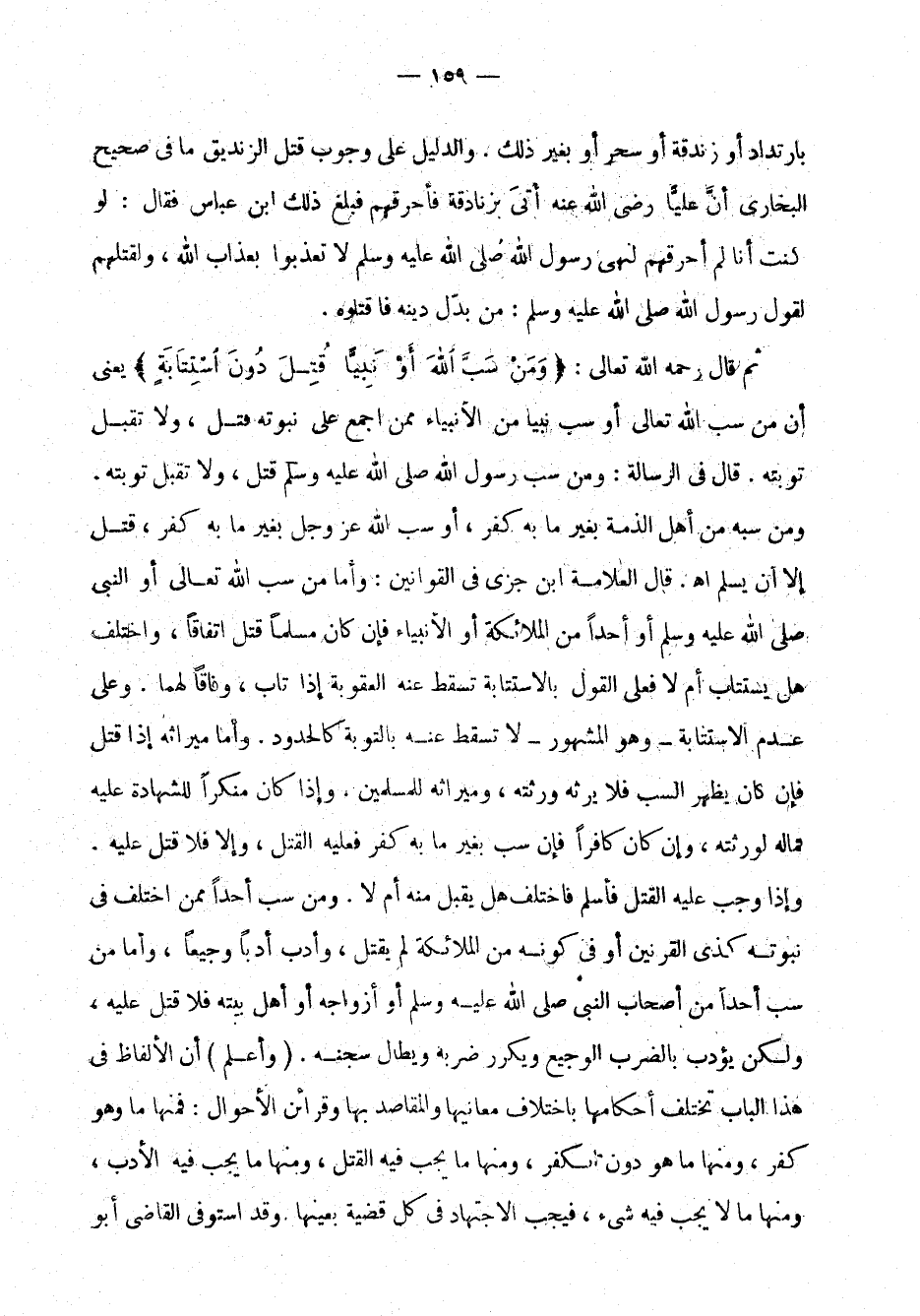ثم قال رحمه الله تعالى: "وَمَنْ سَبَّ اللَّه أضوْ نَبِيًّا قُتِلَ دُونَ اسْتِتابَة" يعني أن من سَبَّ اللَّه تعالى أو سَبَّ نبيًّا من الأنبياء ممن أجمع على نبوته قُتِلَ، وال تُقْبَل توبته. قال في الرسالة: ومَنْ سَبَّ رسول اله صلى الله عليه وسلم قُتشل، ولا تقبل توبته. ومَنْ سَبّه من أهل الذمة بغير ما به كفر، أو سَبَّ الله عزّ وجلّ بغير ما به كفر، قُتِل إلاَّ أن يسلِم اهـ. قال العلاّمة ابن جزي في القوانين: وأما من سضبَّ اللَّه تعالى أو النبي صلى الله عليه وسلم أو أحدًا من الملائكة أو الأنبياء فإن كان مسلمًا قُتِلَ اتفاقًا، واختُلِفَ هل يُستتاب أم لا فَعَلَى القول بالاستتابة تسقط عنه العقوبة إذا تاب، وفاقًا لهما. وعلى عدم الاستتابة - وهو المشهور- لا تسقط عنه بالتوبة كالحدود. وأمَّا ميراثه إذا قُتِلَ فإن كان يظهر السَّبَّ فلا يَرِثُه ورثته، وميراثه للمسلمين. وإذا كان منكرًا للشهادة عليه فمالُهُ لورثته، وإن كان كافرًا فإن سّبَّ بغير ما به كفر فعَلَيْه القتل، وإلاَّ فلا قَتْلَ عليه. وإذا وَجَبَ عليه القتل فأسلَم فاختُلِفَ هل يُقْبَل منه أم لا. ومَنْ سَتَّ أحدًا مِمَّن اختُلِفَ في نبوته كذي القرنين أو في كونه من الملائكة لم يُقْتَل، وأدَّبَ أدبًا وجيعًا، وأمَّا مَنْ سَبَّ أحدًا من أصحاب النبي صلى الله عليه وسلم أو أزواجه أو أهل بيته فلا قَتْلَ عليه، ولكن يؤدَّب بالضَّرْب الوجيع ويكرَّر ضربه ويُطال سجنه. واعلم: أن الألفاظ في هذا الباب تختلف أحكامها باختلاف معانيها والمقصاد بها وقرائن الأحوال: فمنها ما هو كُفْر، ومنها ما هو دون الكفر، ومنها ما يجب فيه القتل، ومنها ما يجب فيه الأدب، ومنها ما لا يجب فيه شيئ، فيجب الاجتهاد في كل قضية