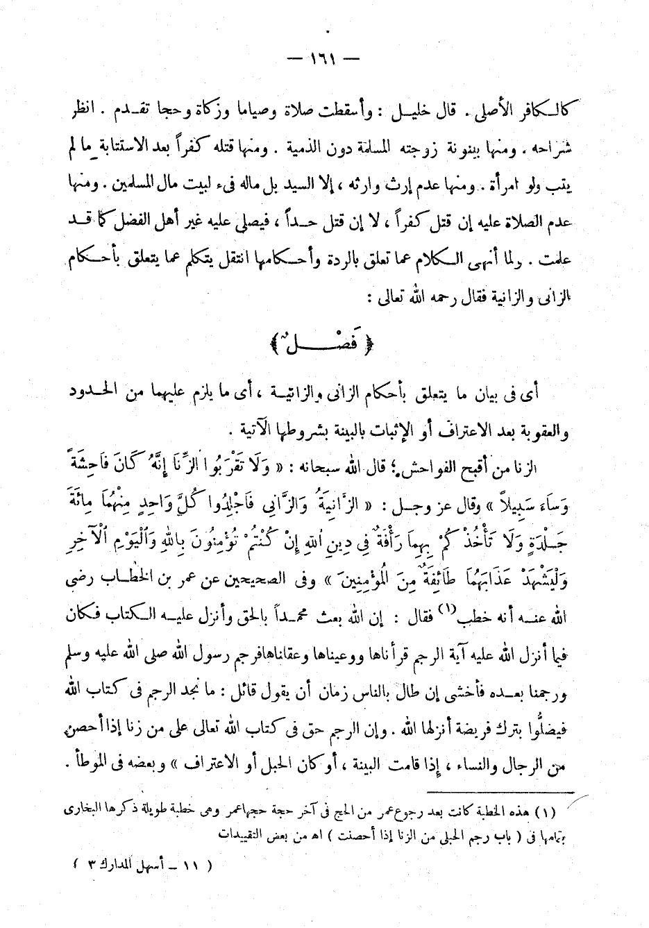 الزَّنا من أقبح الفواحش؛ قال الله سبحانه: ولا تَقْرَبُوا الزِّنَى إنَّهُ كَانَ فَاحِشَةً وسَاءَ سَبِيلاً [الإسراء: 32] وقال عز وجلّ: الزَّانِيَةُ والزَّانِي فَاجْلِدُوا كُلَّ واحِدٍ مِّنْهُمَا مِائَةَ جَلْدَةٍ ولا تَأْخُذْكُم بِهِمَا رَأْفَةٌ فِي دِينِ اللَّهِ إن كُنتُمْ تُؤْمِنُونَ بِاللَّهِ والْيَوْمِ الآخِرِ ولْيَشْهَدْ عَذَابَهُمَا طَائِفَةٌ مِّنَ المُؤْمِنِينَ [النور: 2] وفي الصحيحَيْن عن عمر بن الخطاب، رضي الله عنه، أنه خطب فقال: "إن الله بعث محمدًا بالحق وأنزل عليه الكتاب فكان فيما أنزل الله عليه آية الرجم قرأناها ووَعَيْناها وعقلناها فَرَجَمَ رسول الله صلى الله عليه وسلم ورَجمنا بعده فأخشى إن طال بالناس زمان أن يقول قائل: ما نجد الرجم في كتاب الله فيضلوا بترك فريضة أنزلها الله. وإن الرَّجْمَ حقّ في كتاب اللَّه تعالى على مَنْ زنا إذا أحصن من الرجل والنساء، إذا قامت البينة، أو كان الحبل أو الاعتراف" وبعضه في الموطأ.