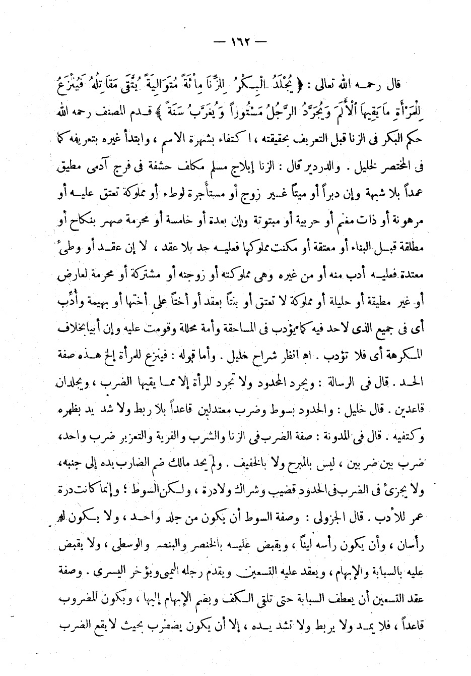 قال رحمه الله تعالى: "يُجْلَدُ الْبِكْرُ لِلزَّنَا مِائَةً مُتَوَاليَةً يُتَّقى مَقَاتِلُهُ فَيُنْزَعُ لِلْمرْأَةِ مَا يَقيهَا الألمَ وَيُجَرَّدُ الرَّجُلُ مَسْتُورًا وَيُغَربُ سَنَةً" قدم المصنَّف رحمه الله حُكْمَ البِكر في الزَّنا قبل التعريف بحقيقته، اكتفاء بشهرة الاسم، وابتدأ غيره بتعريفه كما في المختصر لخيل. والدردير قال: الزنا إيلاج مسلم مكلَّف حَشَفَة في فَرْجِ آدمي مطيق عَمْدًا بِلا شبهة وإن دبرًا أو ميتًا غير زوج أو مستأجرة لوَطْء أو مملوكةَ تُعْتَقُ عليه أو مرهونة أو ذات مغنم أو حربية أو مبتوتة وإن بعدّة أو خامسة أو مَحْرَمة صهر بنِكاح أو مطلقة قبل البناء أو مُعْتَقَة أو مكَّنت مملوكة فعَلَيْه حدٌّ بِلا عَقْد، لا إن عقد أو وَطئ معتدّة فعَلَيْه أدب منه أو من غيره وهي مملوكته أو زوجته أو مشتركة أو مَحرَمة لعارض أو غير مطيقة أو حليلة أو مملوكة لا تُعْتَق أو بنتًا بعَقْد أو أختًا على أختها أو بهيمة وأُدَّ أي في جميع الذي لا حدّ فيه كما يؤدَّب ف يالمساحقة وأمَة محلَّلة وقومت عليه وإن أبيا بخلاف المكرهة أي فلا تؤدَّب اهـ. انظر شراح خليل. وأمَّا قوله: فينزع للمرأة إلخ هذه صفة الحدّ. قال في الرسالة: ويجرَّد المحدود ولا تجرَّد المرأة إلاَّ ممَّا يَقيها الضرب، ويجلدان قاعدّيْن. قال خليل: والحدود بسوط وضَرْب معتدِلَيْن قاعدًا بلا رَبْطٍ ولا شدّ يد بظهره وكتفَيْه. قال في المدوَّنة: صفة الضرب في الزَّنا والشرب والفرية والتعزيز ضرب واحد،