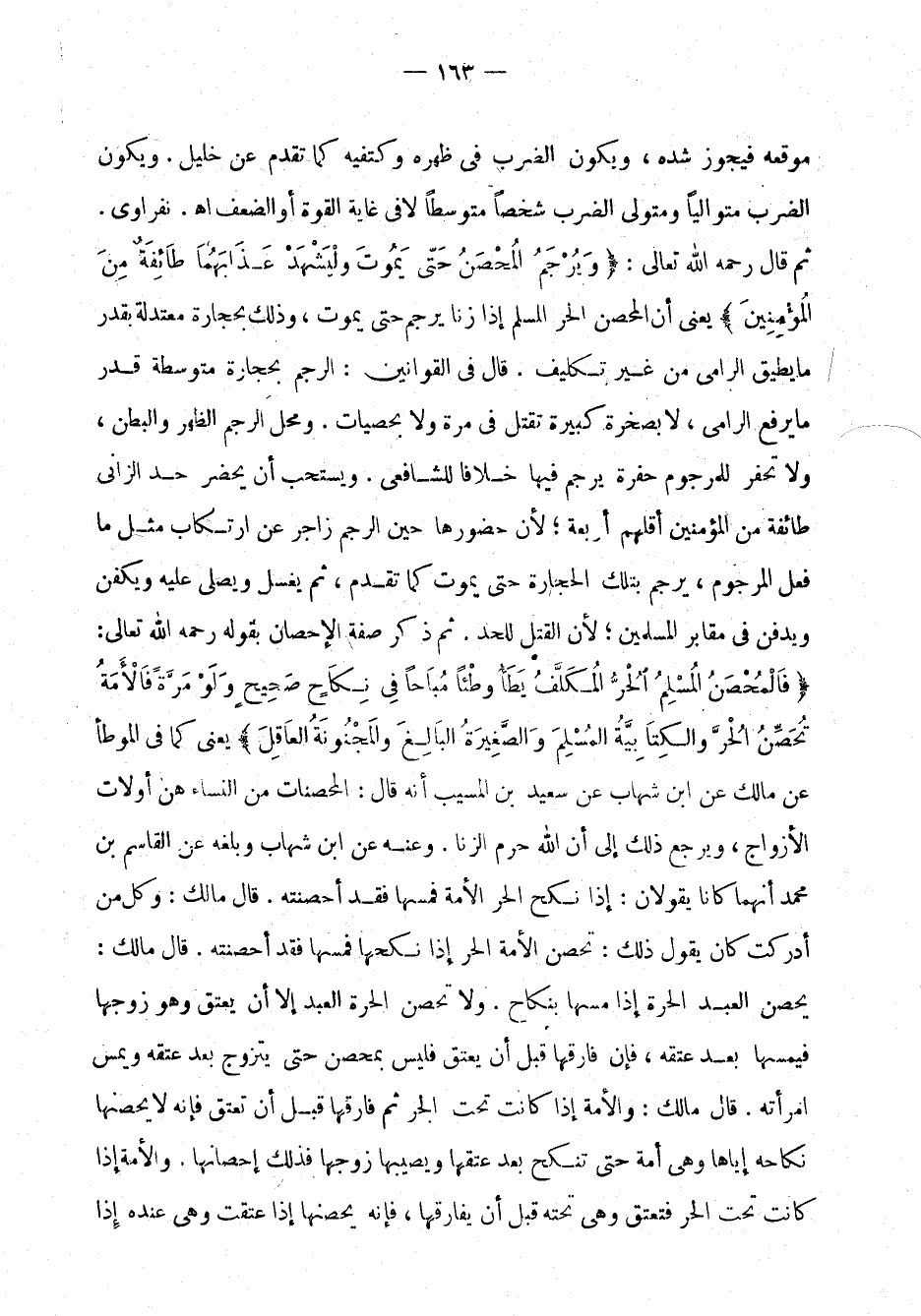 موقعه فيجوز شدُّ، ويكون الضرب في ظهره وكتفَيْه كما تقدَّم عن خليل. ويكون الضرب متواليًا ومتولي الضرب شخصًا متوسطًا لا في غاية القوة أوالضعف اهـ. النفراوي. ثم قال رحمه الله تعالى: "وَيُرْجَمُ المُحْصَنُ حَتّى يَمُوتَ وَلْيَشْهَدْ عَذَبهما طَائِفَةٌ مِنَ المُؤْمِنينَ" يعني أن المحصن الحرَّ المسلِم إذا زَنى يرجم حتى يموت، وذلك بحجارة معتدلة بقدر ما يطيق الرامي من غير تكليف. قال في القاوانين: الرجم بحجارة متوسطة قدر ما يرفع الرامي، لا بصخرة كبير تُقْتِلُ مرّة ولا بحصيات. ومحلُّ الرجم الظهر والبطن، ولا تحفر للمرجوم حفرة يُرْجَم يها خلافًا للشاعفي. ويستحبُّ أن يحضر حدَّ الزاني طائفة من المؤمني أقلُّهم أربعة؛ لأن حضورها حين الرَّجم زاجر عن ارتكاب مثل ما فعل المرجوم، ثُرجم بتلك الحجارة حتى يموت كما تقدَّم، ثم يُغْسَل ويصلَّى عليه ويكفَّن ويُدْفَن في مقابر المسلمين؛ لأن القتل للحدَّ. ثم ذكر صفة اإحصان بقوله رحمه الله تعالى: "فالمُحْصَنُ المُسْلِمُ الْحُرُّ المُكَلَّف يَطأُ وَطْئًا مُبَاحًا فِي نِكَاح صَحِيح وَلَوْ مَرَّة فَلأَمَةُ تُحَصَّنُ الحُرَّ والكِتَابِيَّةُ المُسْلِمَ وضالصَّغِيرَةُ البَالِغَ وَالمَجْنُونَةُ العَاقِل" يعني كما في الموطَّأ عن مالك عن ابن شها عن سعيد بن المسيَّب أنه قال: المحصنات من النساء هنّ أولات الأزواج، ويرجع ذلك إلى الله حرَّم الزَّنا. وعنه عن ابن شهاب وبلغه عن القاسم بن محمد أنهما كانا يقولان: إذا نكح الحرُّ الأمَة فَمَسَّها فقد أحْصَنَتْه. قال مالك: وكلُّ مَنْ أدركت كان يقول ذلك: تحصَّن الأمَة الحرَّ إذا نكحها فَمَسَّها فقد أحْصَنَتْه. قال مالك: يُحصَّن العبد الحرّة إذا مَسَّها بنكاح. ولا تُحَصَّن الحرّة العبد إلاَّ أن يُعْتَقَ وهو زوجها فيمسها بعد عَتْقِهن فإ، فارقها قبل أن يثعْتَقَ فليس بمحصن حتى يتزوَّج بعد عَتْقِه ويَمسَّ امرأته. قال مالك: والأمَة إذا كانت تُنْكَح بعد عَتْقِها ويصيبها زوجها فذلك إحصانها. والأمَة إذا كانت تحت الحرَّ فتُعْتَقُ وهي تحته قبل أن يفارقها، فإنه