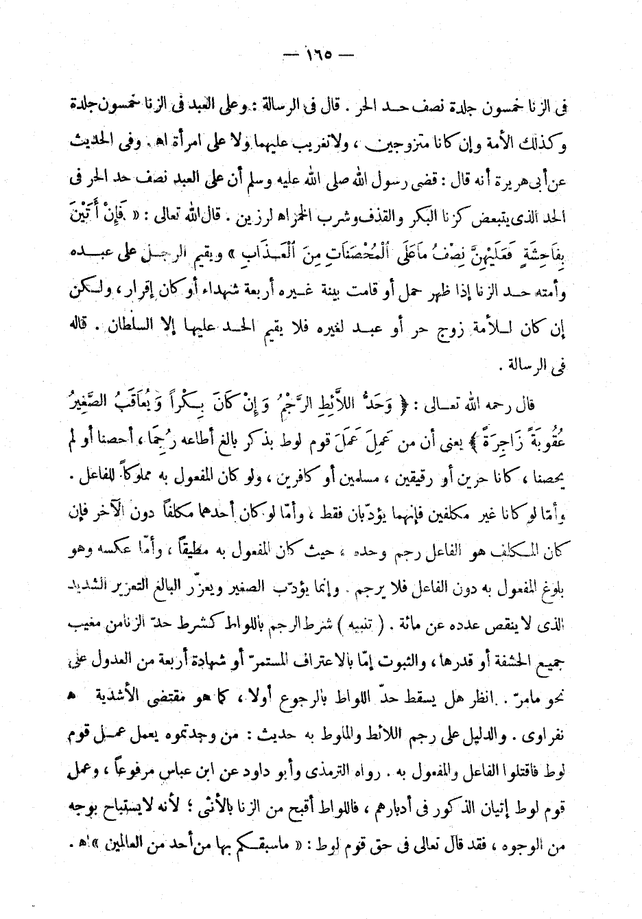 قال رحمه الله تعالى: "وَحَدُّ الرَّقِيقِ خَمْسُونَ دُونَ تَغْرِيب" يعني أحد حدَّ الرقيق في الزَّنا خمسون جَلْدة نِصْفُ حدَّ الحرّ. قال في الرسالة: وعلى العبد في الزنا خمسون جَلدة وكذلك الأمَة وإن كانا متزوَّجَيْن، ولا تغريب عليهما ولا على امرأة اهـ. وفي الحديث عن أبي هريرة أنه قال: قضى رسول الله صلى الله عليه وسلم أن على العبد نِصْفَ حدَّ الحرَّ في الحَّد الذي يتبعَض كزِنَا البِكر والقَذْف وشُرْب الخمر اهـ لزرين. قال الله تعالى: فَإنْ أَتَيْنَ بِفَاحِشَةٍ فَعَلَيْهِنَّ نِصْفُ مَا عَلَى المُحْصَنَاتِ مِنَ العَذَابِ [النساء: 25] ويقيم الرجل على عضبْدِهِ وأمَتهِ حدَّ الزَّنا إذا ظهر حَمْلٌ أو قامت بيَّنة غيره أربعة شهداء أو كان إقرار، ولكن إن كان للأمَة زوج حرٌّ أو عَبْدٌ لغيره فلا يقيم الحدَّ عليها إلاَّ السلطان. قاله في الرسالة.