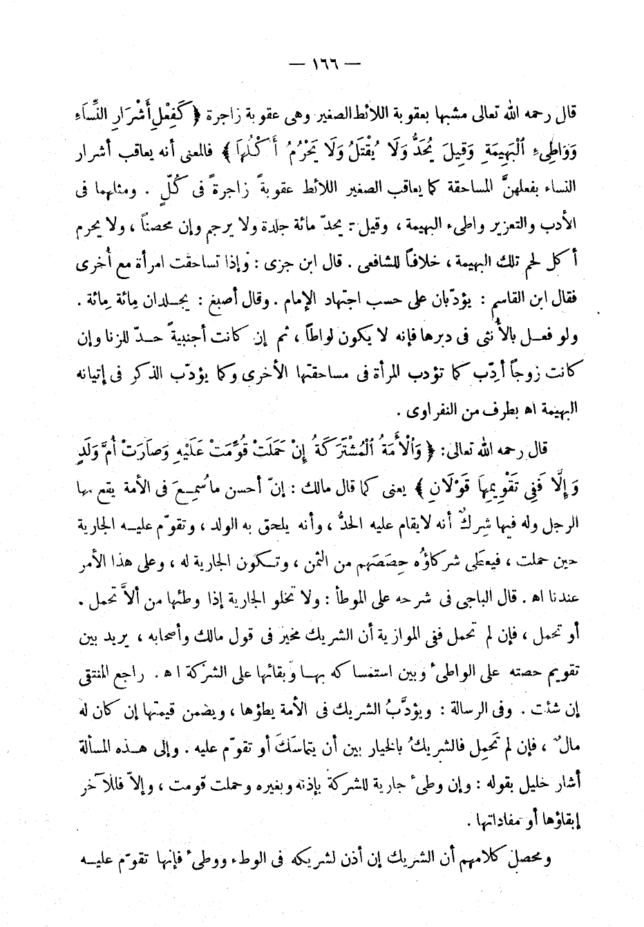 بها وبقائها على الشركة اهـ. راجع المسنتقى إن شئت. وفي الرسالة: ويؤدَّبُ الشريك في الأمَة يطؤها، ويضمن قيمتها إن كان له مالّ، فإ، لم تَحمِل فالشريكُ بالخيار بين أن يتماسَكَ أو تقوّم عليه. وإلى هذه المسألة أشار خليل بقوله: وإن وَطِئ جارية للشركة بإذنه وبغيره وحَمَلَتْ قُوَّمَتُ، وإلاَّ فللآخر إبقاؤها أو مفاداتها. ومحصل كلامهم أن الشريك إن أذِن لشريكه في الوَطءء ووطئ فإنها تُقَوَّم عليه