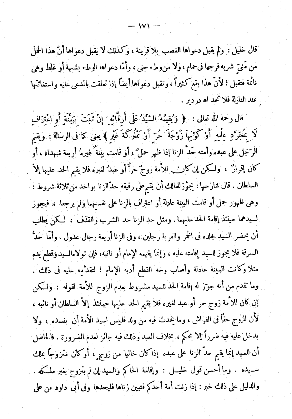 قال رحمه الله تعالىوَيُقِيمُهُ السَّيَدُ عَلَى أَرِقَائِهِ إِنْ ثَبَتَ بِبَيَّنَةٍ أو اعْتِرَافٍ لاَ بِمُجَرَّد عِلْمِهِ أَوْ كَوْنِهَا زَوجْةَ حُر أَوْ مَمْلُوكَةَ غَيْرٍ" يعني كما في الرسالة: ويقيم الرَجل على عَبْدِهِ وأمَتِه حدَّ الزنا إذا ظهر حَمْلٌ، أو قامت بَيَّنَةٌ غيرهُ أربعة شهداء، أو كان إقرار، ولكن إن كان للأمة زوج حر أو عبد لغيره فلا يقيم الحدَّ عليها إلاَّ شروط: وهي ظهور حَمْلٍ أو قامت البيَّنة عادلة أو اعتراف بالزنا على نفسيهما ولم يرجعا، فيجوز لسيَّدهما حينئذ إقامة الحدَّ عليهما. ومثل حدَّ الزَّنا حدُّ الشُّرْب والقذف، لكن يطلب أن يحضر السيد لجَلْدِه في الخمر والفرية رجلَيْن، وفي الزَّنا أربعة رجال عدول. وأمَّا حدُ السرقة فلا يجوز للسيد إقامته عليه، وإنَّما يقيمه الإمام أو نائبه، فإن تولاّه السيد وقَطَعَ يده مثلاً وكانت البيَّنة عادلة وأصاب وَجْهَ القطع أدَّبه الإمام؛ لتقدمِه عليه في ذلك. وما تقدم من أنه جوَّز له إقامة الحَّد للسيد مشروط بعدم الزوج للأمة لقوله: ولكن إن كان للأمَة زوج حرٌّ أو عَبْدٌ لغيره فلا يقيم الحدَّ عليها حينئذِ إلاَّ السلطان أو نائبه، لأن للزوج حقًا في الفراش، وما يحدث فيه من ولد فليس لسيد الأمة أن يفسده، ولا يدخل عليه فيه ضَرَرًا إلاَّ بِحُكْم، بخلاف العبد وذلك فيه جائز لعدم الضرورة. فالحاصل أن السيد إنَّما يقيم حدّ الزَّنا على عَبْدِه إذا كان خاليًا من زوج، أو كان متوجاً بمِلْك سيَّده. وما أحسن قول خليل: وإقامة الحاكم والسيد إن لم يتزوج بغير مِلْكه. والدليل عىل ذلك خبر: إذا زَنَتْ أمَة أحدكم فتبيَّن زِناها فلْيَحِدَّها وفي أبي داود عن عليَّ