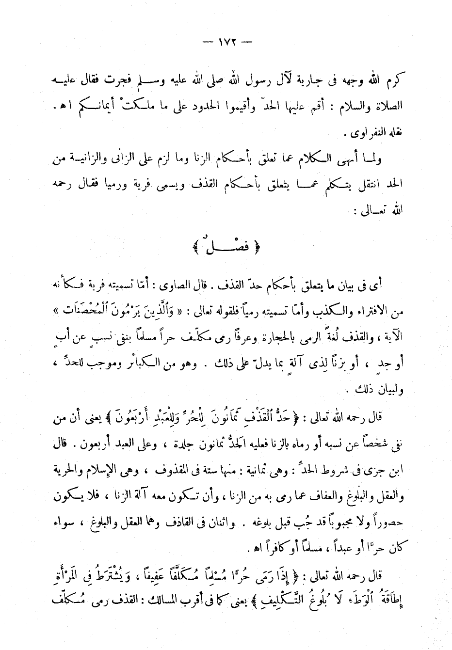 أي في بيان ما يتعلق بأحكام حدّ القذف. قال الصاوي: أمَّا تسميته فرية فكأنه من الافتراء والكذب وأمَّا تسميته رميًا فلقوله تعالى: "وَالَذِينَ يَرمُونَ الْمُحصَنَتِ" [النور: 4] الآية، والقذف لغةً الرمي بالحجارة وعُرْفًا رمي مكلَّف حرًّا مسلمًا بنَفْيِ نسب عن أب أو جدَّ، أو بزِنا لذي آلةٍ بِما يدلُّ على ذلك. وهو من الكبائر وموجب للحدَّ ولبيان ذلك.