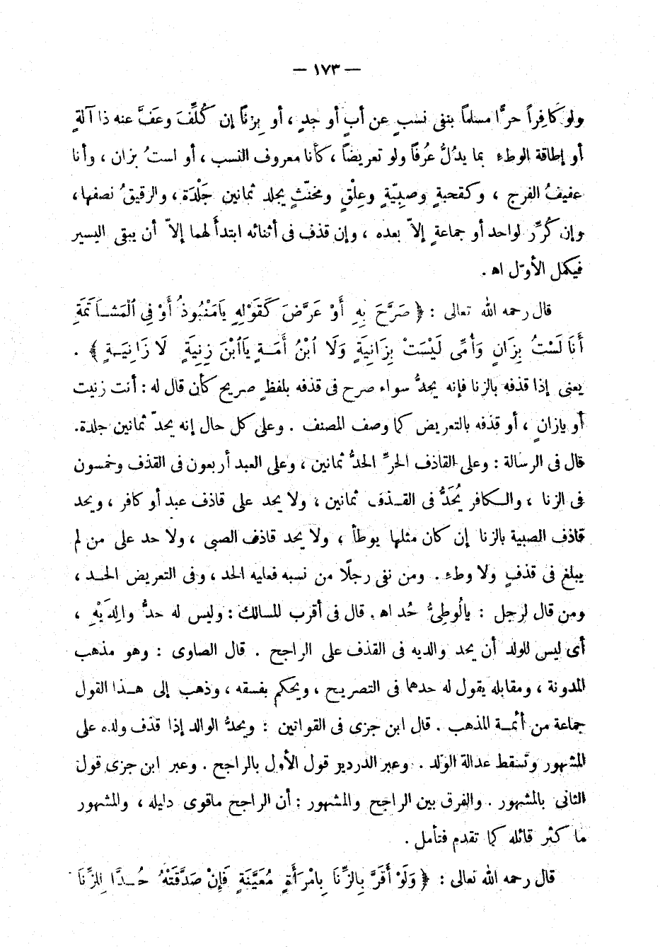 ولو كافِراً حرًّا مسلمًا بنَفْي نسب عن أبٍ أو جد، أو بِزِنًا إن كُلَّفَ وعَفَّ عنه ذا آلةٍ أو إطاقة الوط بما يدلُّ عُرفًا ولو تعريضًا، كأنا معروف النسب، أو لستُ بِزانِ، وأنا عفيفُ الفَرْج، وكقحبةٍ وصبيةٍ وعِلْق ومخنّثٍ بجلد ثمانين جَلْدة، والرقيقُ نِصْفُها، وإن كُرَّر لواحد أو جماعةٍ إلاَّ بعده، وإن قذف في أثنائه ابتدأَ لهما إلاَّ أن يبقى اليسير فيكمل الأوّل اهـ.