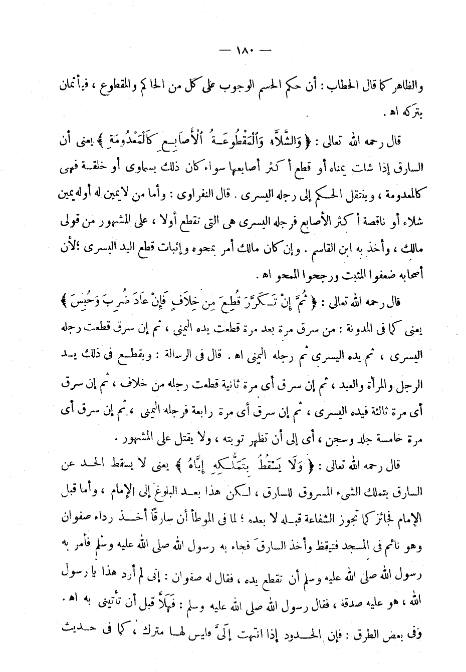 قال رحمه الله تعالى: "وَالشَّلاَّاءُ وَالْمَقْطُوعَةُ الأَصَابع كَالْمَعْدُومةِ" يعني أ، السارق إذا شُلَّت يمناه أو قُطِعَ أكثر أصابعها سواء كان ذلك بسماوي أو خلقة فهي كالمعدومة، وينتقل الحُكْمُ إلى رِجْلِه اليسرى. قال النفراوي: وأمَّا مَنْ لا يمين له أو له يمين شلاء أو ناقصة أكثر الأصابع فرِجْلُه اليسرى هي التي تقطع أولاص، على المشهور من قولَيْ مالك، وأخذ به ابن القاسم. وإن كان مالك أمر بمَحْوِه وإثبات قطع اليد اليسرى؛ لأن أصحابه ضعَّفوا المثبت ورجَّحوا المَمْحو اهـ.