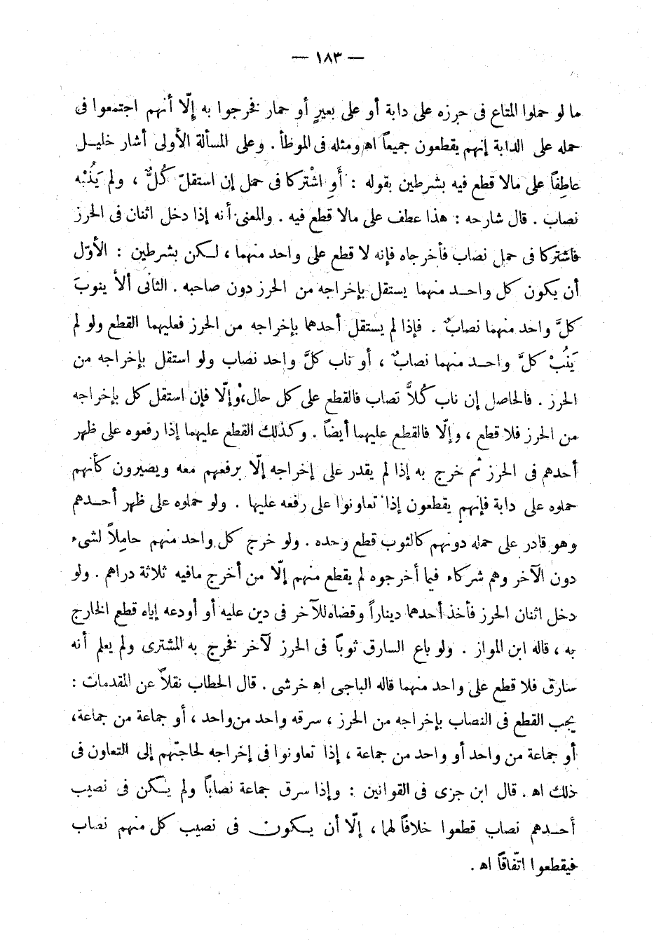 ما لو حملوا المتاع في حِرْزِه على دابة أو على بعير أو حمار فخرجوا به إلاَّ أنهم اجتمعوا في حمله على الدابة إنهم يقطعون جميعًا اهـ. ومثله في الموطَّأ. وعلى المسألة الأولى أشار خليل عاطِفًا على ما لا قطع فيه بشرطَيْن بقوله: أَوِ اشْتركا في حمل إن استقلّ كُلٌّ، ولم يَنُبْه نِصاب. قال شارحه: هذا عطف على ما لا قطع فيه. والمعنى أنه إذا دخل اثنان فيا لحِرْز فاشتركا في حَمْل نِصاب فأخرجاه فإنهلا قطع على واحد منهما، لكن بشرطَيْن: الأول: أن يكون كل واحد منهما يستقلُّ بإخراجه من الحِرْز دون صاحبه. الثاني: ألاَّ ينوبَ كل واحد منهما نِصابٌ. فإذا لم يستقلَّ أحدهما بإخراجه من الحِرْز فعليهما القَطْعُ ولو لم يَنُبْ كلَّ واحد منهما نصابٌ، أو ناب كلَّ واحد نِصاب ولو استقل بإخراجه من الحِرْز. ف الحاصل إن ناب كُلاً نِصاب فالقَطْعُ على كل حال، وإلاَّ فإن استقلَّ كل بإخراجه من الحِرْز فلا قَطْع، وإلاَّ فالقَطْعُ عليهما أيضًا. وكذلك القَطْعُ عليهما