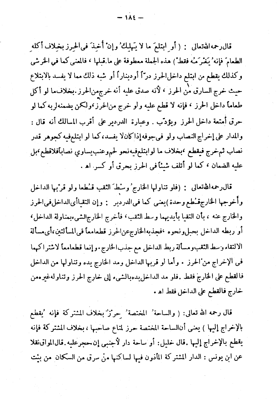 قال رحمه الله تعالى: " "فلَوْ تَنَاوَلَهَا الخَارجُ وَسْطَ الثَّقْبِ قُطعًا وَلَوْ قَرَّبَهَا الدَّاخل وأَخْرَجَهَ الخَارجُ قُطِعَ وَحْدَه" يعني كما في الدردير: وإن التقيا أي الداخل في الحِرْز والخارج عنه، بأن التقيا بأيديهماوسط الثَّقْب، فأخرج الخارج الشيئ بمناولة الداخل، أو ربطه الداخل بحبل ونحوه، فجذبه الخارج عن الحِرْز قُطعا معًا ف يالمسألتَيْن، أي مسألة الالتقاء وسط الثَّقْبِ ومسألة ربط الداخل مع جذب الخارج. وإنَّما قطعا معًا لاشتراكهما في الإخراج من الحِرْز. وأمَّا لو قرَّبها الداخل ومدَّ الخارج يده وتناولها من الداخل فالقَطْعُ على الخارج فقط. فلو مدَّ الداخل يده
