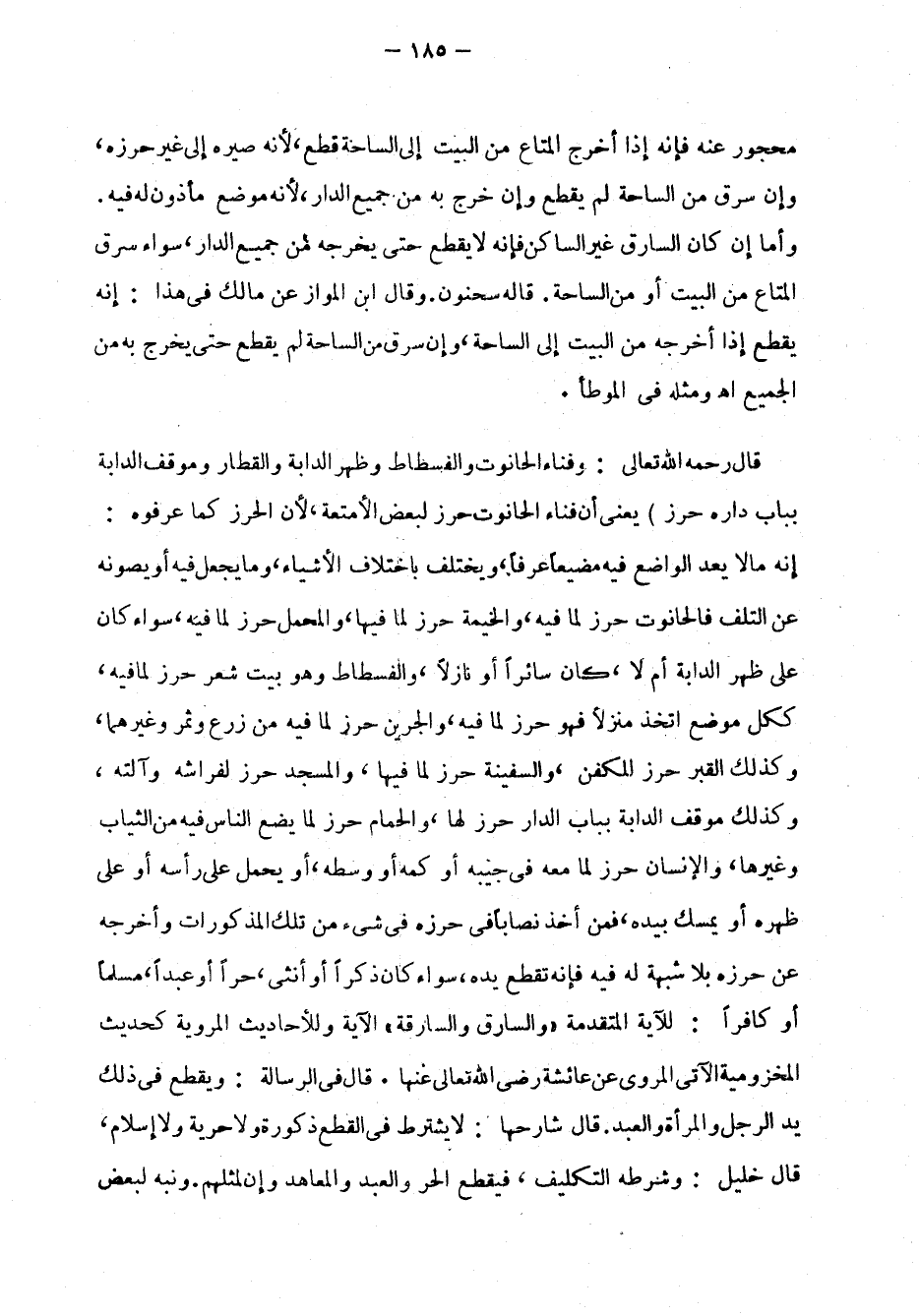 قال رحمه الله تعالى: "وَفَنَاءُ الحَانُوتِ والفُسْطاطِ وظَهْرِ الدَّابة والقِطَار ومَوْقِفِ الدَّابة بِبَابِ دَارِهِ حرْزٌ" يعني أن فناء الحانوت حِرْزٌ لبعض الأمتعة، لأن الحِرْزَ كما عرفوه: إنه ما لا يعد الواضع فيه مضيعًا عَرْفًا، ويختلف باختلاف الأشياء، وما يجعل فيه أو يصونه عن التَّلَفِ فالحانوت حِرْزٌ لِما فيه، والخيمة حِرْزٌ لِما فيها، والمحمل حِرْزٌ لِما فيه، سواء كان علىظهر الدابة أم لأن كان سائرًا أو نازلأن والفسطاط وهو بيت شعر حِرْزٌ لِما فيه، ككل موضع اتخذ منزلاً فهو حِرْزٌ لِما فيه، والجرين حِرْزٌ لِما فيه من زرع وثمر وغيرهما، وكذلك القبر حِرْزٌ للكفن، والسفينة حِرْزٌ لِما فيها، والمسجد حِرْزٌ لفراشهوآلته، وكذلك موقف الدابة بباب الدار حِرْزٌ لها، والحمّام حِرْزٌ لِما يضع الناس فيه من الثياب وغيرها، والإنسان حِرْزٌ لِما معه في جيبه أو كمه أو وسطه، أو يحمل على رأسه أو على ظهره أو يسمك بيده، فَمَن أخذ نِصاباً في حِرْزِه في شيئ من تلك المذكورات وأخرجه عن حِرْزه بلا شُبهة له فيه فإنه تُقْطع يده، سواء كان ذكرًا أو أنثى، حرًّا أو عضبْدًا، مسلمًا أو كافرًا: للآية المتقدَّمة " والسَّارِقُ والسَّارِقَةُ" الآية وللأحاديث المروية كحديث المخزومية الآتي المروي عن عائشة، رضي الله تعالى عنها. قال في الرسالة: ويُقْطَعُ في ذلك يد الرجل والمرأة والعبد. قال شارحها: لا يُشْتَرَطْ في القَطْعِ ذكورة ولا حرَّية ولا إسلام، قال خليل: وشَرْطُه التكليف، فيُقْطَعُ الحر والعبد والمعاهد وإن لِمِثْلِهم. ونُبَّهَ لبعض