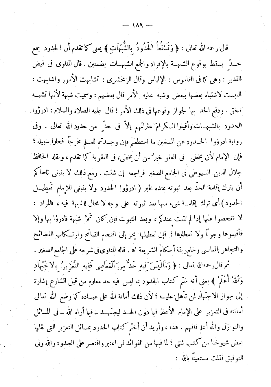 قال رحمه الله تعالى: "وَتَسْقُطْ الْحُدُودُ بِالشُّبُهَاتِ" يعني كما تقدَّم أن الحدود جمع حدًّ يسقط بوقوع الشبهة بالإفراد والجمع الشبهت بضمتين. قال المناوي في فيض القدير: وهي كما في القاموس: الإلباس وقال الزمخشري: تشابهت الأمور واشتبهت: التبست لاشتباه بعضها ببعض وشبه علهي الأمر قال بعضهم: وسميت شبهة لأنها تشبه الحق. ودفع الحد بها لجواز وقوعها في ذلك الأمر؛ قال عليه الصلاة والسلام: "ادرؤوا الحدود بالشبهات وأقيلوا الكرامَ عثراتهم إلاَّ في حدًّ من حدود الله تعالى". وفي رواية ادرؤوا الحدود عن المسلمين ما استطعتم فإن وجدتم للمسلم مخرجًا فخلوا سبيله؛ فإن الإمام لأن يخطئ في العفو خيرٌ من أن يخطئَ في العقوبة كما تقدَّم، ونقله الحافظ جلال الدين السيوطي في الجامع الصغير فراجعه إن شئت. ومع ذلك لا ينبغي للحاكم أن يترك إقامة الحدّ بعد ثبوته عنده لخبر (ادرؤوا الحدود ولا ينبغي للإمام تَعطِيل الحدود) أي ترك إقامة شيئ منها بعد ثبوته على وجه لا مجال للشبهة فيه، فالمراد: لا تفحصوا عنها إذا لم تثبت عندكم، وبعد الثبوت فإن كان ثَمَّ شبهة فادرؤوا بها وإلاَّ فأقيموها وجوبًا ولا تعطلوها؛ فغن تعطيلها يجر إلى اقتحام القبائح وارتكاب الفضائح والتجاهر بالمعاصي وخلع ربقة احكام الشريعة اهـ. قال المناوي في شرحه على الجامع الصغير.