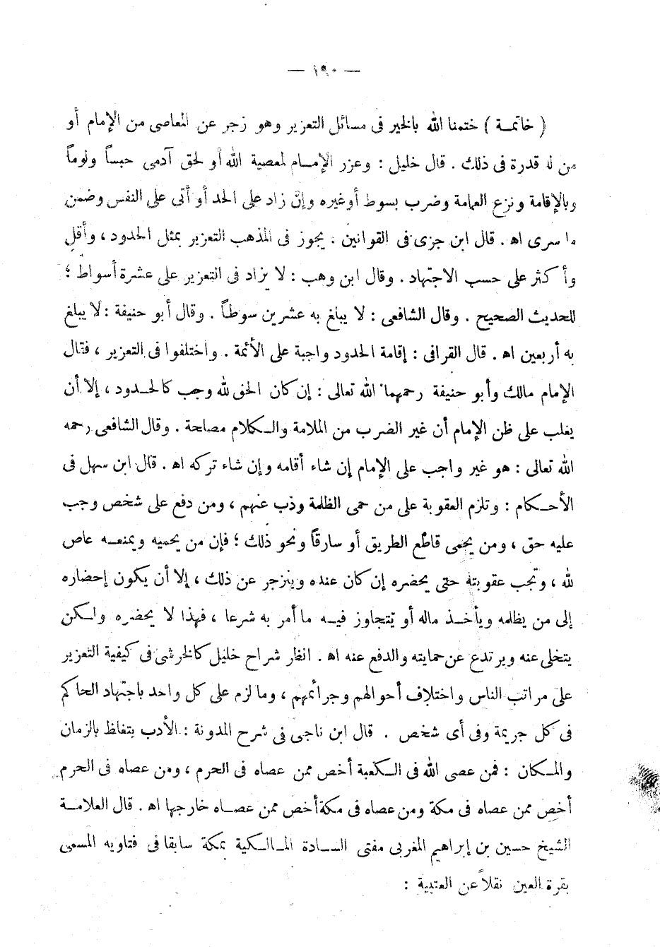 أتى على النفس وضمن ما سرى اهـ. قال ابن جزي في القوانين. يجوز في المذهب التعزيز بمثل الحدود، وأقل وأكثر على حَسَبِ الاجتهاد. وقال ابن وهب: لا يزاد في التعزير على عشرة أسواط؛ للحديث الصحيح. وقال الشافعي: لا يبلغ به عشرين سوطًا. وقال أبو حنيفة: لا يبلغ به أربعين اهـ. قال القرافي: إقامة الحدود واجبة على الأئمة. واختلفوا ي التعزير، فقال الإمام مالك وأبو حنيفة رحمهما اللهَّ تعالى: إن كان الحق للَّه وجب كالحدود، إلاَّ أن يغلب على ظن الإمام أن غير الضرب من الملامة الكلام مصلحة. وقال الشافعي رحمه الله تعالى: هو غير واجب على الإمام إن شاء أقامه وإن شاء تركه اهـ. قال ابن سهل في الأحكام: وتلزم العقوبة على من حمى الظلمة وذبَّ عنهم، ومن دفع على شخص وجب عليه حق، ومن يحمي قاطع الطريق أو سارقًاونحو ذلك؛ فإن من يحميه ويمنعه عاصٍ للَّه، وتجب عقوبته حتى يحضره إن كان عنده وينزجر عن ذلك، إلاَّ أن يكون إحضاره إلى من يظلمه ويأخذ ماله أو يتجاوز فيه ما أمر به شرعًا، فهذا لا يحضره ولكن يتخلى عنه ويرتدع عن حمايته والدفع عنه اهـ. انظر شراح خليل كالخرشي في كيفية التعزير على مراتب الناس واختلاف أحوالهم وجرائمهم، وما لزم على كل واحد باجتهاد الحاكم في كل جريمة وفي أي شخص. قال ابن ناجي في شرح المدوَّنة: الأدب يتغلَّظ بالزمان والمكان: فمن عصى اللَّه في الكعبة أخصُّ ممن عصاه في الحرم، ومنعصاه في الحرم أخصذُ ممن عصاه في مكة ومن عصاه في مكة أخصُّ ممن عصاه خارجها اهـ. قال العلاّمة الشيخ حسين بن إبراهيم المغربي مفتي السادة المالكية بمكة سابقًا في فتاويه المسمّى بقرة العين نقلاً عن العتبية: