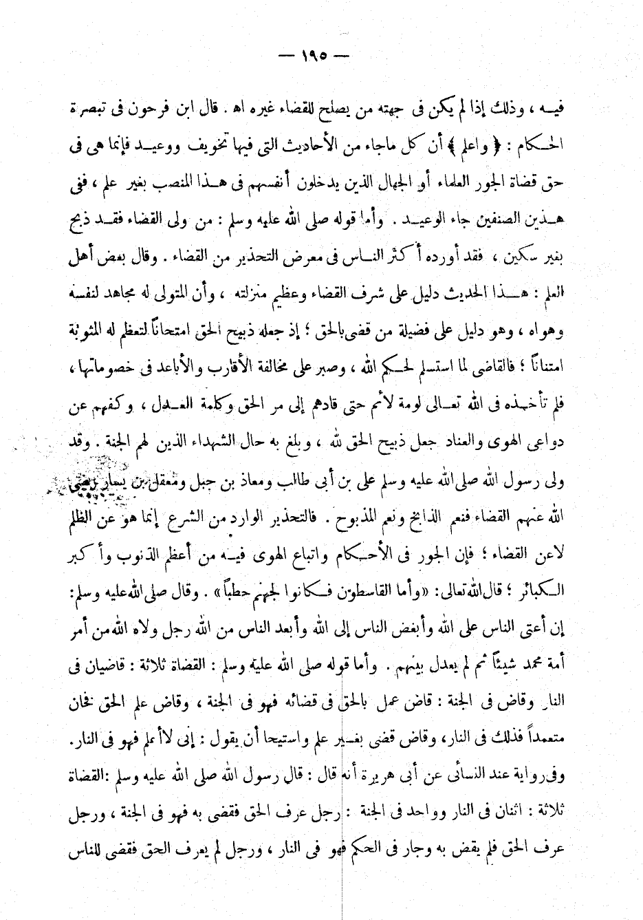 فيه، وذلك إذا لم يكن في جهته من يصلح للقضاء غيره اهـ. قال ابن فرحون في تبصرة الحكام: واعلم: أن كل ما جاء من الأحاديث التي فيها تخويف ووعيد فإنَّما هي في حق قضاة الجور العلماء أو الجهال الذين يدخلون أنفسهم في هذا المنصب بغير علم، ففي هذين الصنفين جاء الوعيد. وأمَّا قوله صلى الله عليه وسلم: "من ولي القضاء فقد ذبح بغير سكين"، فقد أورده أكثر الناس في معرض التحذير من القضاء.
