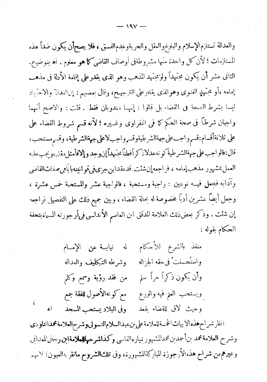 والعدالة تستلزم الإسلام والبلوغ والعقل والحرية وعدم الفسق، فلا يصحُّ أن يكون ضد هذه المستلزمات؛ لأن كل واحد منها مشروطة في أوصاف القاضي كما هو معلوم. اهـ. بتوضيح. الثاني عشر: أن يكون مجتهدًا ولو مجتهد المذهب وهو الذي يقدر على إقامة الأدلة في مذهب إمامه، أو مجتهد الفتوى وهو الذي يقدر على الترجيح، وقال بعضهم: إن العدالة والاجتهاد ليسا بشرط الصحة في القضاء بل قالوا: فقط. قلت: والأصحُّ أنهماواجبان شرطًا في صحة الحكم كما في النفراوي وغيره؛ لأنه قسم شروط القضاء على ثلاثة أقسام: قسم واجب على جهة الشرطية وقسم واجب لا على جهة لشرطية، وقسم مستحبّ، قال: فالواجب على جهة الشرطية كونه عدلاً ذكرًا فطنًا مجتهدًا إن وجد وإلاَّ ف أمثل مقلد، ويبج عليه العمل بمشهور مذهب إمامه، فراجعه إن شئت. قد عقد ابن جزي في قوانينه بابًا في صفات لقاضي وأدابه فجعل فيه نوعين: واجبة ومستحبة، فالواجبة عشر والمستحبة خمس عشرة، وجعل أيضًا عشرين أدبًا مخصوصة له بحالة القضاء، وبيَّن جميع ذلك على التفصيل فراجعه إن شئت. وذكر بعض ذلك العلاّمة المدقق ابن العاصم الأندلسي في أرجوزته المسمّاة بتحفة الحكام بقوله: