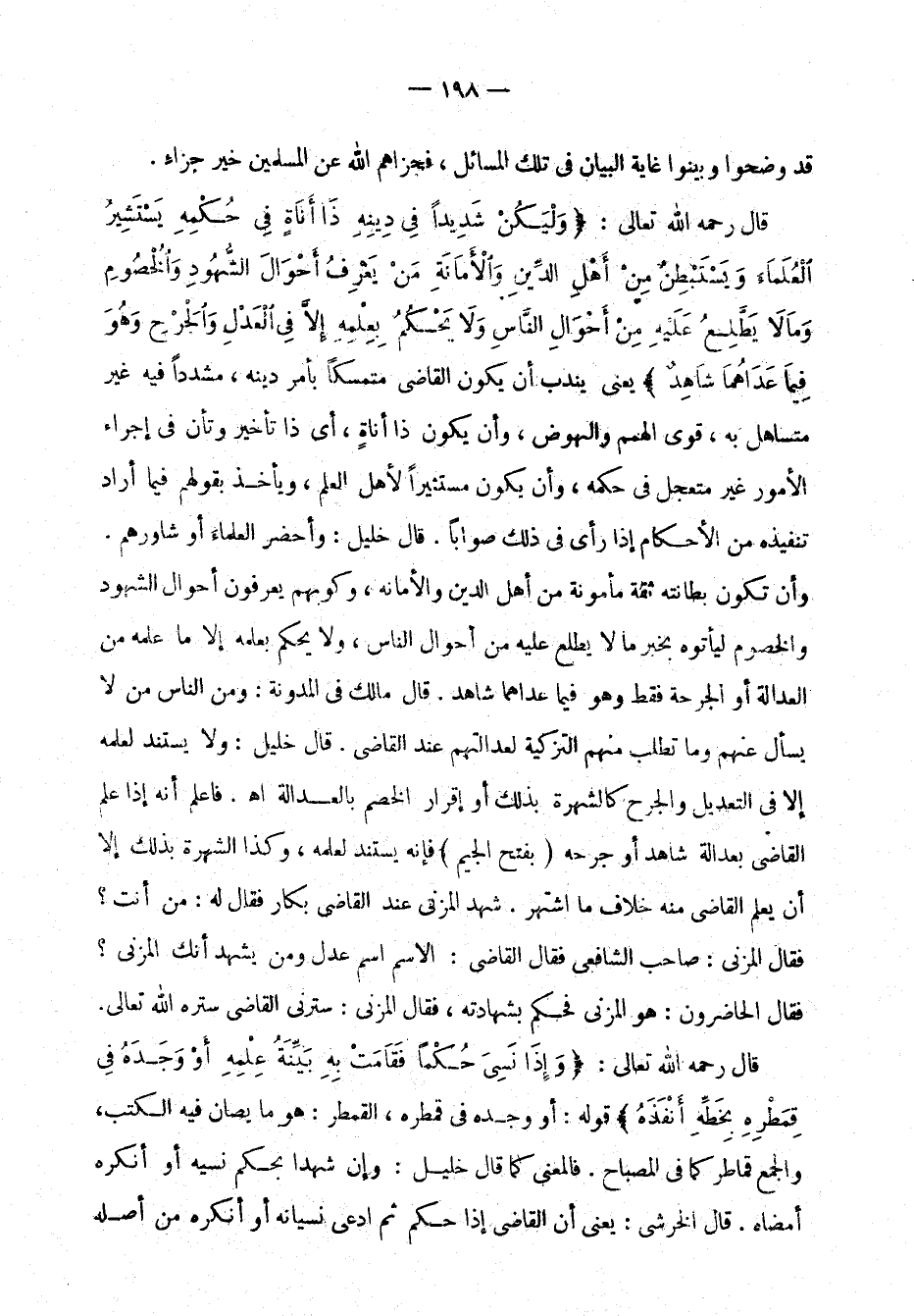 قال رحمه الله تعالى: "وَلْيَكُنْ شَدِيدًا فِي دِينِهِ ذَا أَنَاة في حُكْمِهِ يَسْتَشِيرُ الْعُلَمَاءَ وَيَسْتَبْطِنُ مِنْ أَهْلِ الدَّينِ وَالأَمَانَةِ مَنْ يَعْرِفُ أَحْوالَ الشّثهُودِ وَاْخُصُوم وَمَا لاَ يَطَّلِعُ عَلَيْهِ مِنَ أَحْوَالِ النَّاسِ وَلاَ يَحْكُمُ بِعِلْمِهِ إِلاَّ فِي الْعَدْلِ وَالْجَرحِ وَهُوَ فيمَا عَدَاهُمَا شَاهِدٌ" يعني يندب أن يكون القاضي متمسكًا بأمر دينه، مشددصا فيه غير متساهل به، قوي الهمم والنهوض، وأن يكون ذا أناةٍ أي ذا تأخير وتأنَّ في إجراء الأمور غير متعجل في حكمه، وأن يكون مستشيرًا لأهل العلم، ويأخذ بقولهم فيما أراد تنفيذه من الأحكام إذا رأى في ذلك صوابًا. قال خليل: وأحضر العلماءَ أو شاورهم. وأن تكون بطانته ثقة مأمونة من أهل الدَّين والأمانة، وكونهم يعرفون أحوال الشهود والخصوم ليأتوه بخبر ما لا يطَّلع علهي من أحوال الناس، ولا يحكم بِعلْمِه إلاَّ ما عَلِمَه منالعدالة أو الجرحة فقط وهو فيما عداهما شاهد. قال مالك في المدوَّنة: ومن الناس من لا يسأل عنهم وما تطلب منهم التزكية لعدالتهم عند القاضي. قال خليل: ولا يستند لعلمه إلاَّ في التعديل والجرح كالشهرة بذلك أو إقرار الخصم بالعدالة اهـ. فاعلَم أنه إذا علم القاضي بعدالة شاهد أو جرحه بفتح الجيم فإنه يستند لِعِلْمِه، وكذا الشهرة بذلك إلاَّ أن يعلم القاضي منه خلاف ما اشتهر. شهد المزني عند القاضي بكار فقال له: من أنت؟ فقال المزني: صاحب الشافعي فقال القضاي: الاسم اسم عدل ومن يشهد أنك المزني؟ فقال الحاضرون: هو المزني فحكم بشهادته، فقال المزني: سترني القاضي ستره اللَّه تعالى.