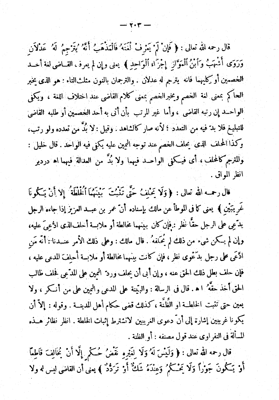 قال رحمه اللَّه تعالى: "فَإنْ لَمْ يَعْرِفُ لُغَتَهُ فَالْمَذْهَبُ أَنَّهُ يُتَرْجِمُ لَهُ عَدْلاَنِ وَرَوَى أَشْهَبُ وَابْنُ الْمَوَّاز إِجْزَاءَ الْوَاحِدِ" يعني ,عن لم يعرف القاضي لغة أحد الخصمَ ... يْن أو كِليهما فإنه يترجم له عدلان. والترجمان بالنون مثلَّث التاء: هو الذي يخبر الحاكم بمعنى لغة الخصم ويخبر الخصم بمعنى كلام القاضي عند اختلاف اللغة، ويكفي الواحد إن رتَّبه القاضي، وأمَّا غير المرتَّب بأن أتى به أحد الخصمَيْن أو طلبه القاضي للتبليغ فلا بدّ فيه من التعدُّد؛ لأنه صار كالشاهد. وقيل: لابُدَّ من تعدُّده ولو رُتَّب، وكذا المحلَّف الذي يحَلَّف الخصم عند توجُّه اليمين عليه يكفي فيه الواحد. قال خليل: والمترجم كالمحلَّلأن أي فيكفي الواحد فيهما ولابُدَّ من العدالة فيهما اهـ. الدرديري انظر الموّاق.