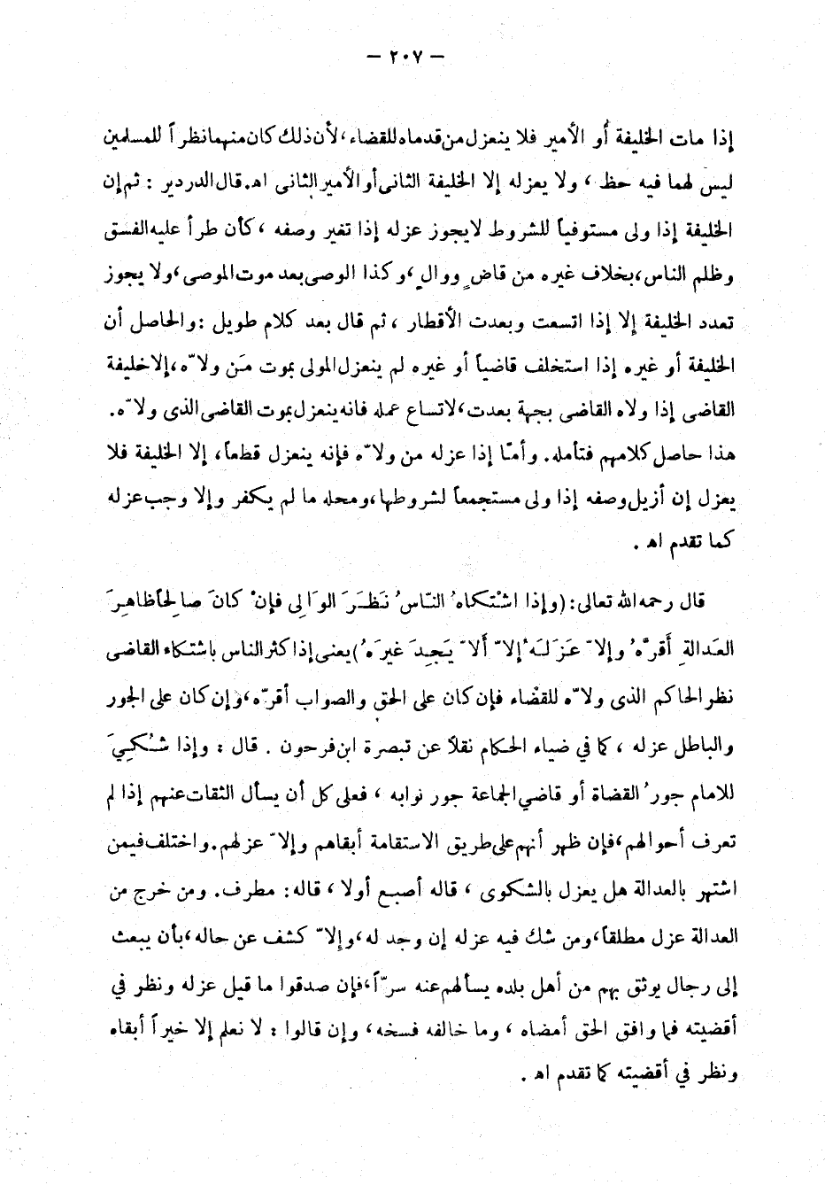 إذا مات الخليفة أو الأمير فلا ينعزل مَنْ قدّضماه للقضاء، لأن ذلك كان منهما نظرًا للمسلمين ليس لهما فيه حظ، ولا يعزله إلاَّ الخليةف الثاني أو الأمير الثاني اهـ. قال الدردير: ثم إن الخليفة إذا ولي مستوفيًا للشروط لا يجوز عزله إذا تغيَّر وَصْفُه، كأن طرأ عليه الفِسق وُلم الناس، بخلاف غيره من قاضٍ ووالٍ، وكذا الوصيّ بعد موت الموصي، ولا يجوز تعدُّد الخليفة إلاَّ إذا اتسعتوبَعْدَتِ الأقطار، ثم قال بعد كلام طويل: والحاصل أن الخليفة أو غيره إذا استخلف قاضيًا أو غيره لم ينعزل المولى بموت مَن ولاّه، إلاَّ خليفة القاضي إذا ولاّه القاضي بجهة بَعْدَت، لاتساع عَمَلِه فإنه ينعزل بموت القاضي الذي ولاه. هذا حاصل كلامهم فتأمَّله. وأمَّ إذا عزله مَنْ ولاّه فإنه ينعزل قَطْعًا، إلاَّ الخليفة فلا يُعْزَل إن أزيل وَصْفُه إذا ولي مستجمعًا لشروطها، ومحل ما لم يكفر وإلاَّ وَجَبَ عَزْلُه كما تقدَّم اهـ.