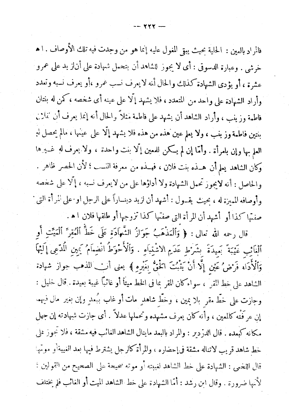 مال فيهما إن عرفَتْه كالمعين، وأنه كان يعرف مشهده وتحمَّلها عَدْلاً. أي جازت شهادته إن جهل مكانه كبُعْدِه. قال الدردير: والمراد بالبُعْد ما ينال الشاهد الغائب فيه مشقة، فلا تجوز على خط شاهد قريب لا تنااله مشقّة في إحضاره، والمرأة كالرجل يُشْتَرَط فيها بعد الغيبة أو موتها قال اللخمي: الشهادة على خطَّ الشاهد لغيبته أو موته صحيحة على الصحيح من القولَيْن؛ فأنها ضرورة. وقال ابن رشد: أمَّ الشهادة على خطَّ الشاهد الميت أو الغائب فلم يختلف