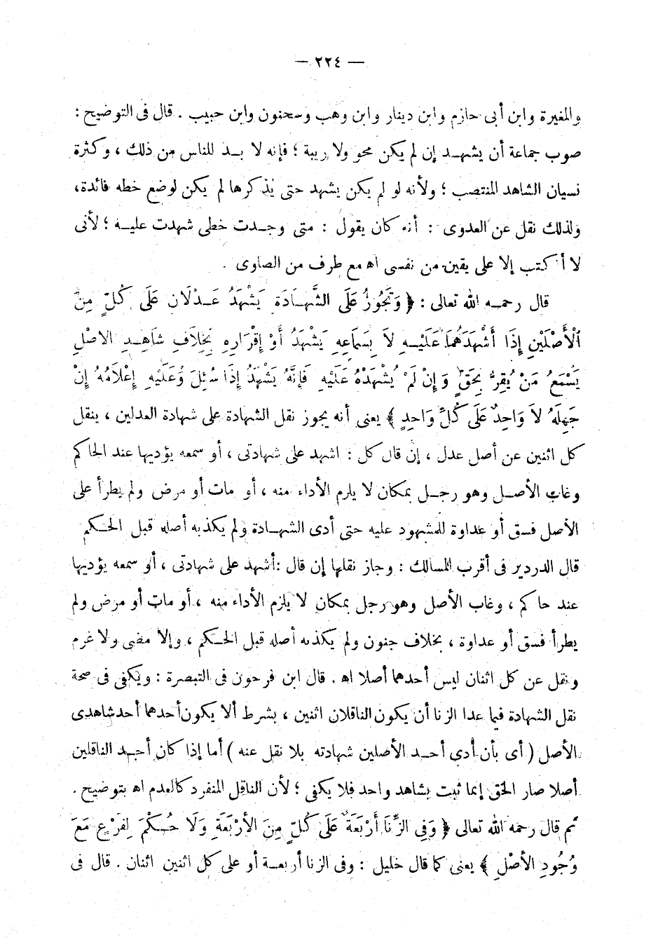 قال رحمه الله تعالى: "وَتَجوزُ عَلَى الشَّهَادَةِ يَشْهَدُ عَدْلاَنِ عَلَ كلَّ مِنَ الأَصْلَيْنِ إِذا أَشءهَدَهُمَا عَلَيْهِ لاَ بِسَمَاعِهِ يَيْهَدُ أَوْ إِقْرَارِهِ بِخِلافِ شَاهِدِ الأَصْل يَسْمَعُ مَنْ يُقِرُّ بِحَقًّ وَإِنْ لضمْ يُشْهَدْهُ عَلَيْهِ فإِنَّهُ يَشْهَدُ إِذَا سُئِلَ وزَعَلَيْهِ إعْلاَمُهُ إِنْ جَهِلَهُ لاَ وَاحِدْ عَلَى كُلَّ وَاحِدس:؛ يعني أنه يجوز نضقل الشهادة على شهادة العدلين، ينقل كل اثنين عن أصل عَدْلن إن قال كل: أشهد على شهادتي، أو سمعه يؤدّيها عند الحاكم وغاب الاصل وهو رجل بمكان لا يلزم الأداء منه، أو مات أو مرض ولم يطرأ على الأصل فِسْقٌ أو عداوة للمشهود عليه حتى أدّى الشهادة ولم يكذبه أصله قبل الحكم قال الدردير في أقرب المسالك: وجاز نَقْلُها إن قال: أشهد على شهادتي، أو سمعه يؤدّيها عند الحاكم، وغاب الأصل وهو رجل بمكان لا يلزم الأداء منه، أو مات أو مرض ولم يطرأ على الأصل فِسْقٌ أو عداوة بخلاف جنون ولم يكذبه أصله قبل الحُكْم، وإلاَّ مضى ولا غُرْمَ ونُقِلَ عن كل اثنان ليس أحدهما أصلاً اهـ. قال ابن فرحون في التبصرة: ويكفي فس صِحّة نَقْلِ الشهادة فيما عدا الزَّنا أن يكون الناقلان اثنَيْن، بِشَرْط ألاَّ يكون أحدهما أحد شاهدي الأصل (أي بأن أدّى أحد الأصلَيْن شهادته فلا نَقْلَ عنه) أمَّا إذا كان أحد الناقلَيْن أصلاً صار الحقُّ إنَّشما ثبت بشاهد واحد فلا يكفي؛ لان الناقل المنفرد كالعدم اهـ. بتوضيح.