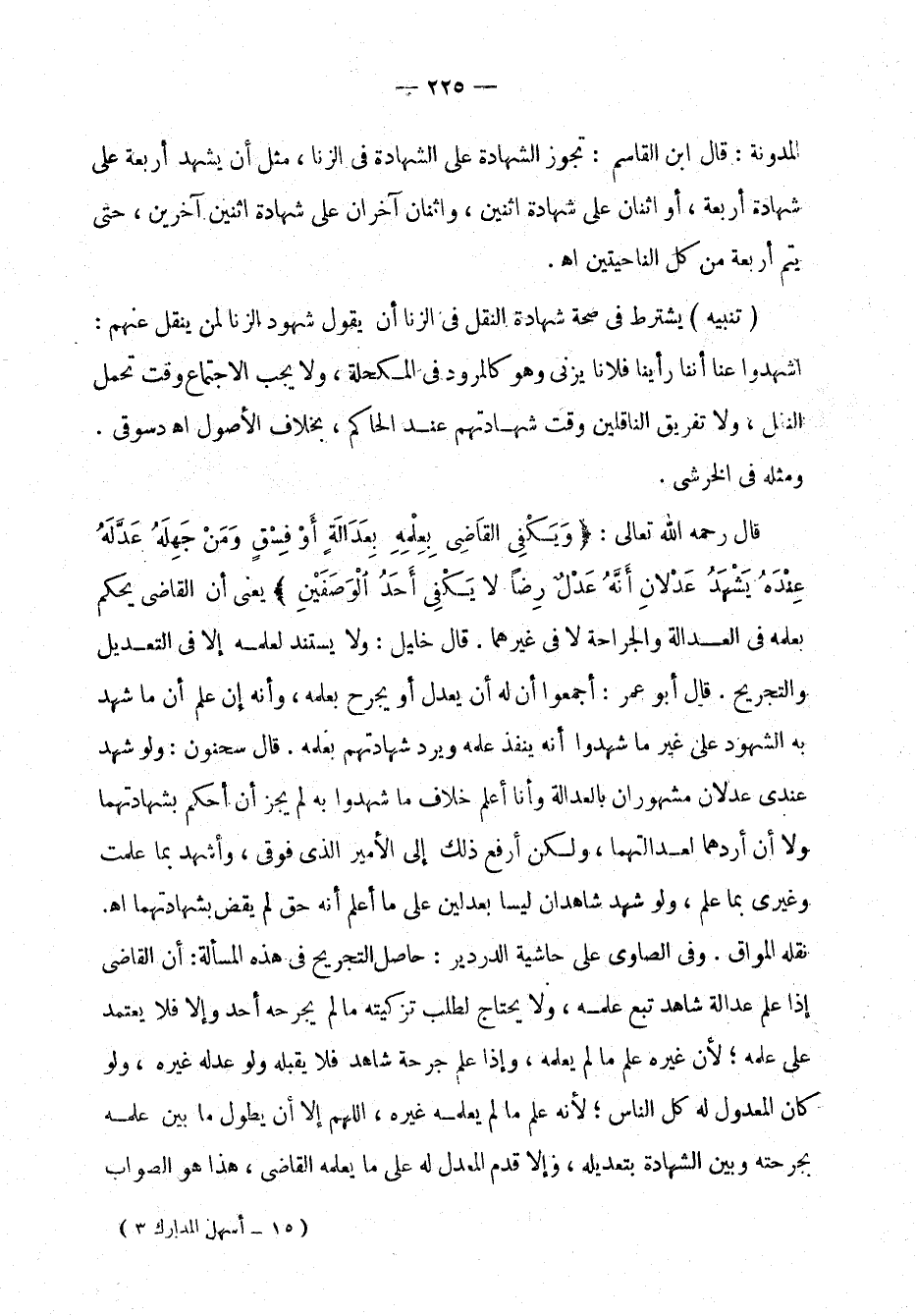 قال رحمه اللَّه تعالى: "وَيَ ... كْفِي القَاضِي بِعِلْمِهِ بِعَدَالَةٍ أَوْ فِسْقٍ وَمَنْ جَهلَهُ عَدَّله عَنْدَهُ يَشْهَدُ عَدْلانِ أَنَّنهُ عَدْلٌ لا يَكْفِي أَحدُ الْوَصْفَيْنِ" يعين أن القاضي يضحْكُمُ بعِلْمِه في العدالة والجراحة لا في غيرهماز قال خليل: ولا يستند لعِلْمِهِ إلاَّ في التعديل والتجريح. قال أبو عمر: أجمعوا أن له أن يعدل أو يجرح بِعلْمِه، وأنه