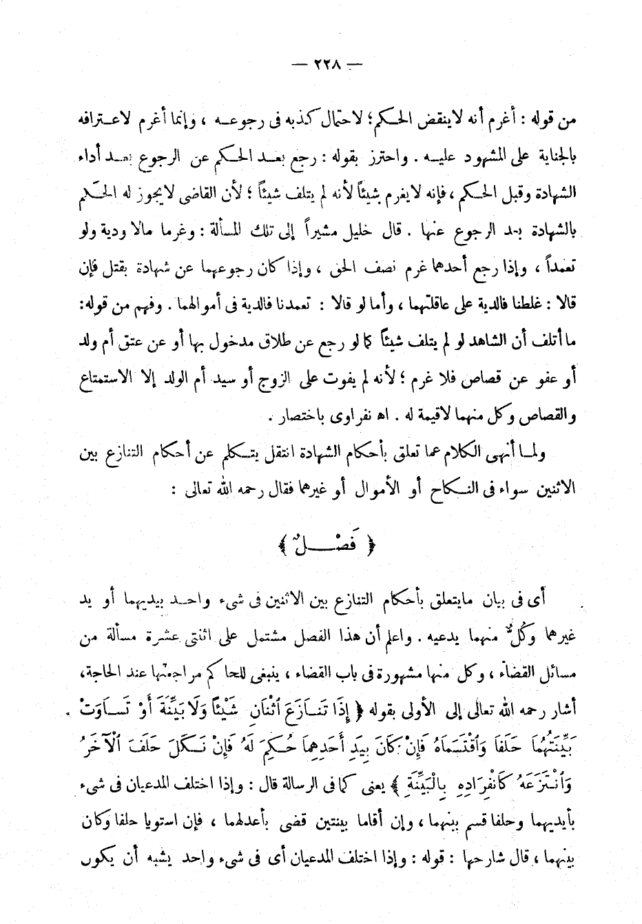 ولمَّا أنهى الكلام على ما تعلَّق بأحكام الشهادة انتقل يتكلم على أحكام التنازع بين الاثنين سواء في النكاح أو الأموال أو غيرهما فقال رحمه الله تعالى: