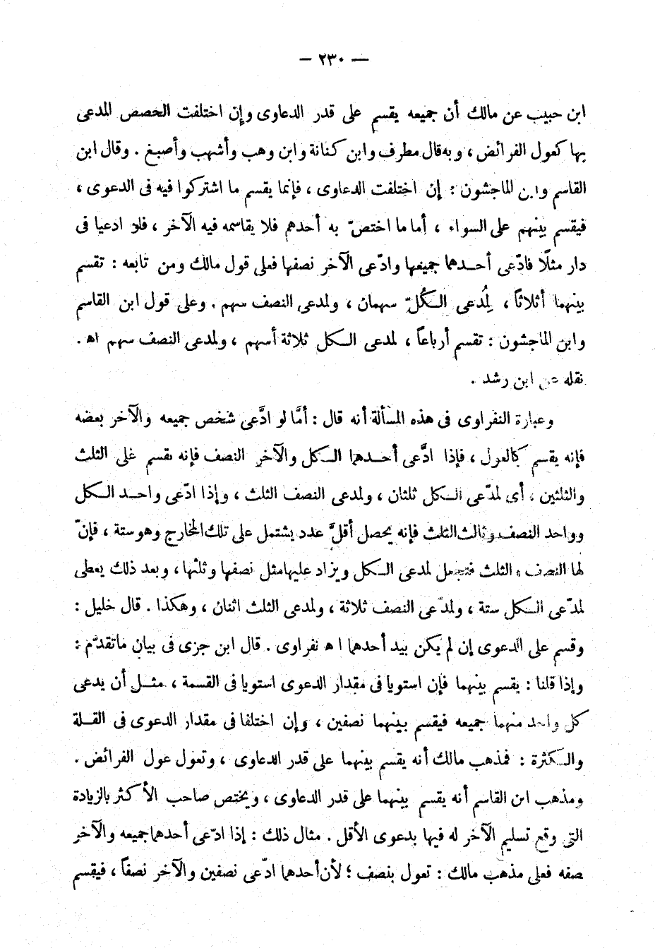 ابن حبيب عن مالك أن جميعه يُقَسَّم على قدر الدعاوى وإن اختلفت الحِصَص المدَّعى بها كعَوْل الفرائض، وبه قال مطرف وابن كنانة وابن وهب وأشهب وصبغ. وقال ابن القاسم وابن الماجشون: إن اختلفت الدعاوى، فإنَّما يُقَسَّمُ ما اشتركوا فيه في الدعوى، فيُقَسَّم بينهم على السواء، أمَّا ما اختصّ به أحدهم فلا يقاسمه فيه الآخر، فلو ادّعيا في دار مثلاً فادّعى أحدهما جميعها وادّعى الآخرَ نِصْفَها فعلى قول مالك ومضنْ تابعه: تُقَسَّم بينهما أثلاثًا، لِمُدّعي الكُلّ سهما، ولمُدَّعي النَّصْفَ سهم. وعلى قول ابن القاسم وابن الماجشون: تُقَسَّمُ أربعاًا، لمُدَّعي الكل ثلاثة أسهم، ولمُدَّعي النَّصْفَ سهم اهـ. نَقَلَه عن ابن رشد.