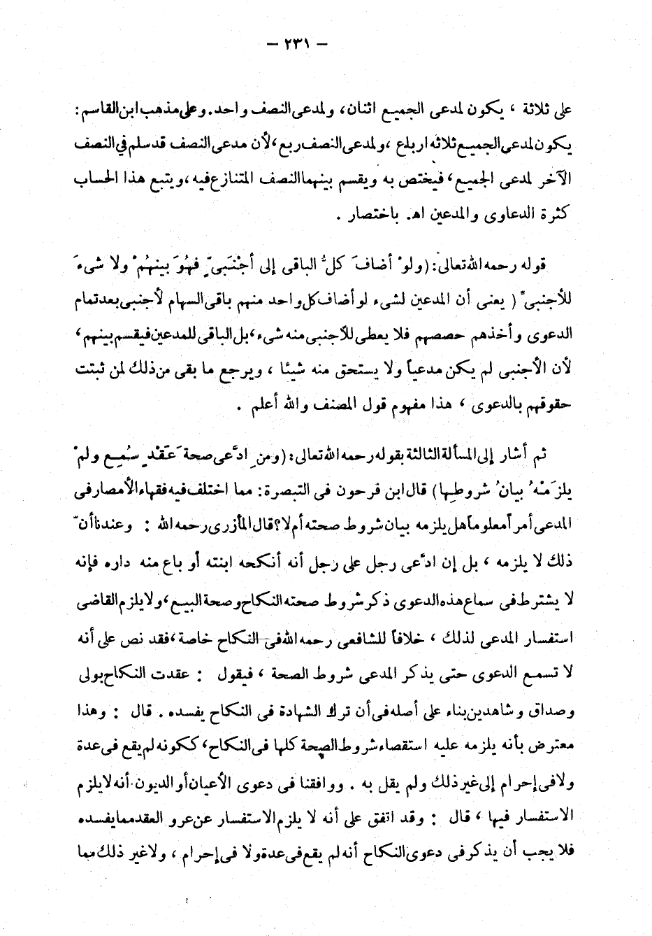 قوله رحمه اللَّه تعالى: ولوْ أضافَ كلّ الباقي إلى أجْنَبيًّ فهُوَ بينهُمْ ولا شيئ للأجنبيَّ" يعني أن المدعين لشيئ لو أضاف كل واحد منهم باقي السهام لأجنبي بعد تمام الدعوى وأخْذهم حِصَصهم فلا يُعطى للأجنبي منه شيئ، بل الباقي للمدَّعين فيقَسَّم بينهم، لأن الأجنبي لم يكن مدَّعيصا ولا يستحقُّ منه شيئًا، ويرجع ما بقي من ذلك لِمَن ثبتت حقوقهم بالدعوى، هذا مفهوم قول المصنَّف واللَّه أعلم.