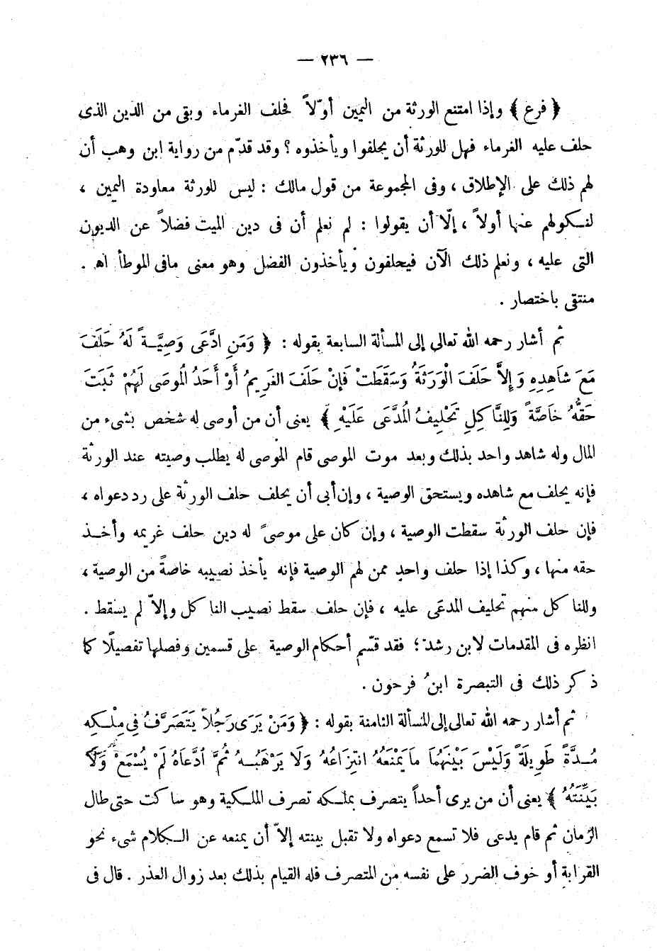 ثم أشار رحمه اللَّه تعالى إلى المسألة السابقةبقنوله: "وَمَنِ ادَّعَى وَصِيَّةً لَهُ حَلَفَ مَعَ شضاهِدِهِ وَإلاَّ حَلَفَ الْوَرَثَةُ وَسَقَطَتْ فَإِنْ حَلَفَ الغَريمُ أَوْ أَحَدُ المُوصَى لَهُمْ ثَبَتَ حَقُّهُ خَاصّةً وَلِنَّاكِلِ تَحْلِيفُ المُدَّعَى عَلَيْهِ" يعني أ، مَنْ أوصى له شخص بشيئ من المال وله شاهد واحد بذلك وبعد موت الموصي قام الموصى له بطلب وصيَّته عند الورثة فإنه يَحْلِف مع شاهده ويستحقُّ الوصية، وإن أبى أن يضحْلِف حَلَفَ الورثة على رَدَّ دعواه، فإن حَلَفَ الورثة واحد مِمَّن لهم الوصية فإنه يأخذ نصيبه خاصةً من الوصية، وللناكل منهم تحليف المدَّعَى عليه، فإن حَلَفَ سقط نصيب الناكل وإلاَّ لم يسقط. انظره في المقدَّمات لابن رشد؛ فقد قَسَّمَ أحكام الوصية على قِسْمَيْن وفصَّلها تفصيلاً كما ذكر ذلك في التبصرة ابنُ فرحون.