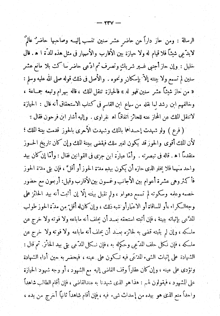الرسالة: ومَنْ حاز داراً عن حاضرٍ عشر سنين تُنْسَبُ إليه وصاحبها حاضرٌ عالمٌ لا يدَّعِي شيئًا فلا قيام له ولا يحازة بين الأقارب والأصهار في مثل هذه المدة اهـ. قال خليل: وإن حاز أجنبي غير شريكٍ وتصرَّف ثم ادّعى حاضر ساكت بلا مانع عشر سنين لم تُسْمَع ولا بيَّنة إلاَّ بإسكان ونحوه. والأصل في ذلك قوله صلى الله عليه وسلم: "مَنْ حاز شيئًا عشر سنين فهو له" فالحيازة تَنْقُل المِلْك، قاله بهرام وتَبِعه جماعة، وخالفهم ابن رشد لِما نَقَلَه من سماع ابن القاسم في كتاب الاستحقاق أنه قال: الحيازة لا تَنْقُل المِلْك عن المحاز عنه للحائز اتفاقًا اهـ النفراوي. وإليه أشار ابن فرحون فقال: