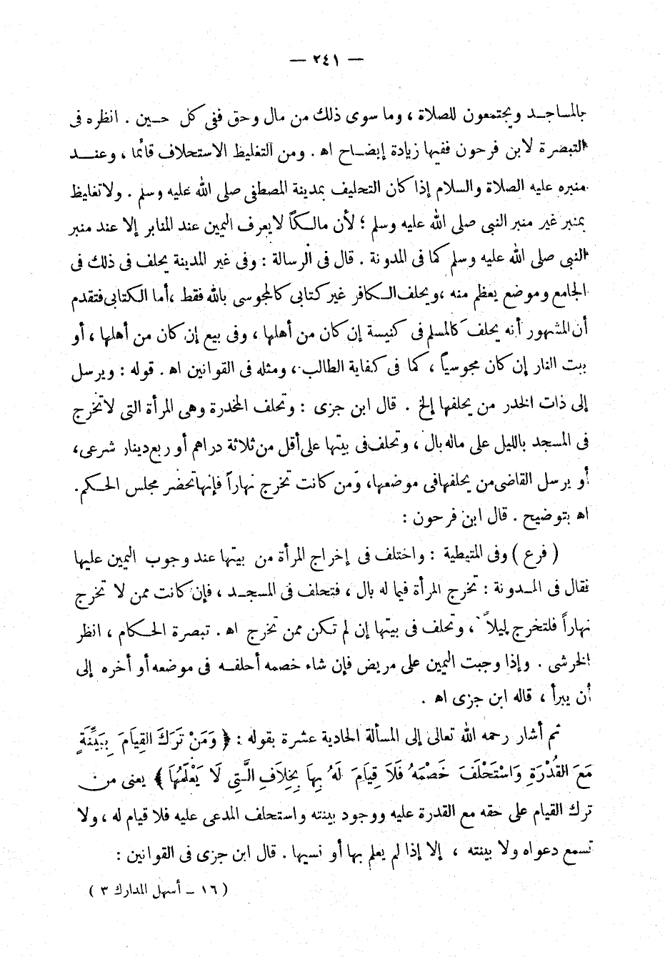 فرع: وفي المتّيطية: واختُلِفَ في إخراج المرأة من بيتها عند وجوب اليمين عليها فقال في المدوَّنة: تخرج المرأة فيما له بال، فتَحْلِفُ في المسجد، فإ، كانت ممن لا تخرج نهارًا فلتخرج ليلاً، وتَحْلِفُ في بيتها إن لم تكن ممَّن تخرج اهـ. تبصرة الحكام، انظر الخرشي. وإذا وَجَبَتِ اليمين على مريض فإن شاء خصمه أحْلَفَه في موضعه أو أخَّره إلى أن يبرأ، قاله ابن جزي اهـ.