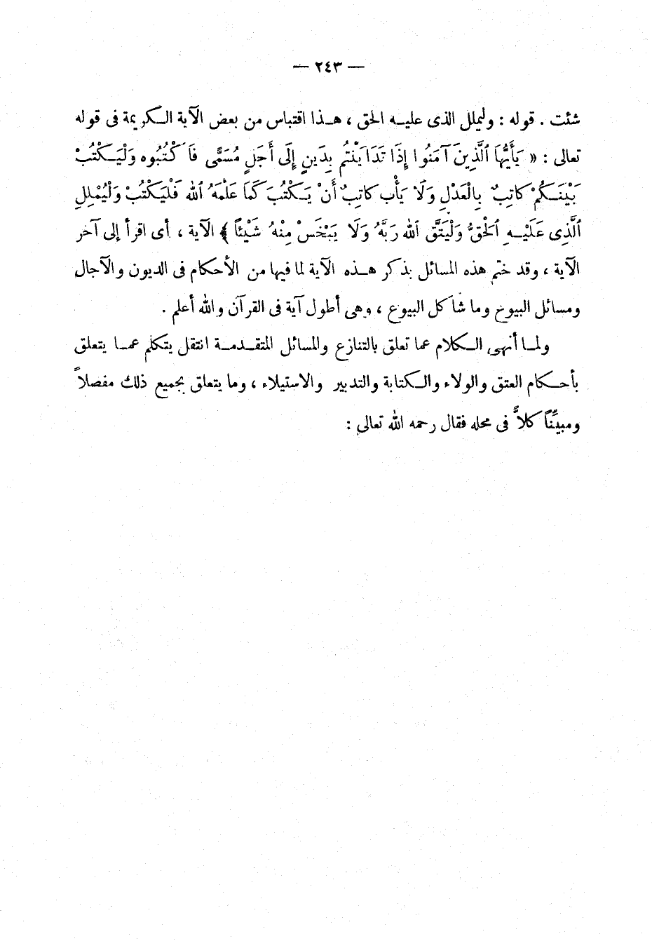 فَلْيَكْتُبْ ولْيُمْلِلِ الَّذِي عَلَيْهِ الحَقُّ ولْيَتَّقِ اللَّهَ رَبَّهُ ولا يَبْخَسْ مِنْهُ شَيْئًا. [البقرة: 282] الآية، اقرأ إلى آخر الآية، وقد ختم هذه المسائل بذكر هذه الآية لِما فيها من الأحكام في الديون والآجال ومسائل البيوع وما شاكل البيوع، وهي أطول آية في القرآن والله أعلَم.