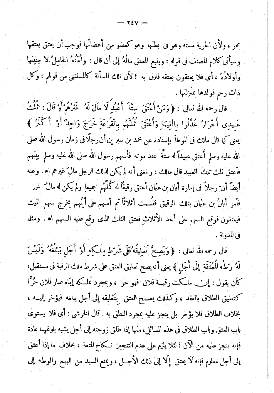 قال رحمه الله تعالى: "وَمَنْ أَعْتَقَ سِتَّةَ أَعْبُدٍ لاَ مَالَ لَهُ غَيْرُهُمْ أَوْ قَالَ: ثُلُثُ عَبِيدِي أَحْرار عُدَّلُوا بِالْقيمَةِ وَأَعْتَقَ ثُلثُهم بِالْقُرْعَةِ خَرَجَ وَاحِدٌ أَوْ أَكْثَرُ" يعني كما قال عبيدًا له ستَّة عند موته فأسهم رسول الله صلى الله عليه وسلم بينهم فأعتق ثُلُث تلك العبيد قال مالك: وبلغني أنه لم يكن لذلك الرجل مالٌ غيرهم اهـ. وعنه أيضًا أنّ رجلاً في إمارة أبان بن عثمان بتلك الرقيق فقَسَّمَتْ أثلاثًا ثم أسهم على أيَّهم يخرج سهم الميت فيُعْتَقون فوقع السهم على أحد الأثلاثِ فعَتَقَ الثُّلُث الذي وقع عليه السهم اهـ. ومثله ي المدوَّنة.