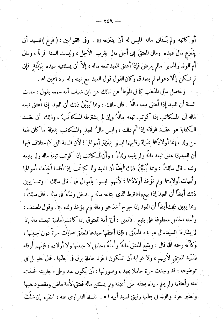 وحاصل ما في المذهب كما في الموطَّأ عن مالك عن ابن شهاب أنه سمعه يقول: مضت السنّة أن العبد إذا أُعتق تبعه مالُهُ. قال مالك: ومما يُبَيَّنُ ذلك أن العبد إذا أُعتِق تبعه مالُهُ أن المكاتب إذا كوتب تبعه مالُهُ وإن لم يشترطه المكاتَبُ، وذلك أن عقد الكتابة هو عقد الولاءِ إذا تَم ذلك، وليس مالُ العبدِ والمكاتب بمنزلة ما كان لهما من ولد، إنَّما أولادُهما بمنزلة رقابهما ليسوا بمنزلةِ أموالهما؛ لان السنّة التي لا اختلاف فيها أن العبد إذا عُتِقَ تبعه مالُهُ ولم يتبعه ولدُهُ وأن