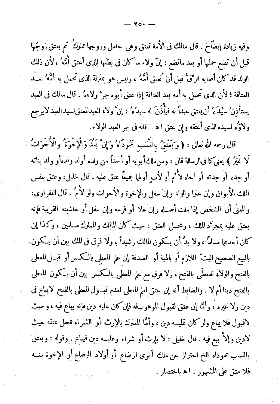 قال رحمه اللَّه تعالى: "وَيَعْتِقُ بِالنَّسَبِ عَمُدَاهُ وَإِنْ بَعُدَ وَالإِخْوَةُ والأَخوَاتُ لاَ غَيْرُ" يعني كما في الرسالة قال: ومَنْ ملك أبوَيْه أو أحدًا من ولده أو ولد ولده أو ولد بناته أو جدّه أو جدّته أو أخاه لأُمَّ أو لأبٍ أو لهماجميعًا عُتِقَ عليه. قال خليل: وعُتِقَ بنفس المِلْك الأبوان وإن علَوْا والولد وإن سفل والإخوة ولاأخوات ولو لأُمًّ. قال النفراوي: والمعنى أن الشخص إذاملك أصله وإن علا أو فرعه وإن سفل أو حاشيته القريبة فإِنه يُعْتَقُ عليه بمجرَّد المِلْك، ومحل العَتْق: حيث كان المالك والمملوك مسلمين، وكذا إن كان أحدهما مسلِمًا، ولابدَّ أن يكون المالك رشيدًا، ولا فرق ... في المِلْك بين أن يكون بالبيع الصحيح البتّ اللازم أو بالهبة أو الصّدَقة إن عَلِمَ المُعطِي بالكسر أو قبل المُعطَى بالفتح والولاءُ للمُعطَى بالفتح، ولا فرقَ مع عِلْم المُعطِى بالكسر بين أن يكون المُعطَى بالفتح دَيْنًا أم لا. والضابط أنه إن عُتِقَ لِعِلْم المُعَطي لعدم قبول المُعطَى بالفتح لا يُباع في دَيْنٍ ولا غيره، وأمَّا إن عُتِقَ لقبول الموهوب له فإن كان عليه دَيْنٌ فإنه يُباع فيه، وحيث لاَ قبول فلا يُباع ولو كان عَليه دَيْن، وأمَّا المملوك بالإرث أو الشراء فمحلّ عَتْقِهِ حيث لا دَيْن وإلاَّ بِيع فيه. قال خليل: لا بإرث أو شراء