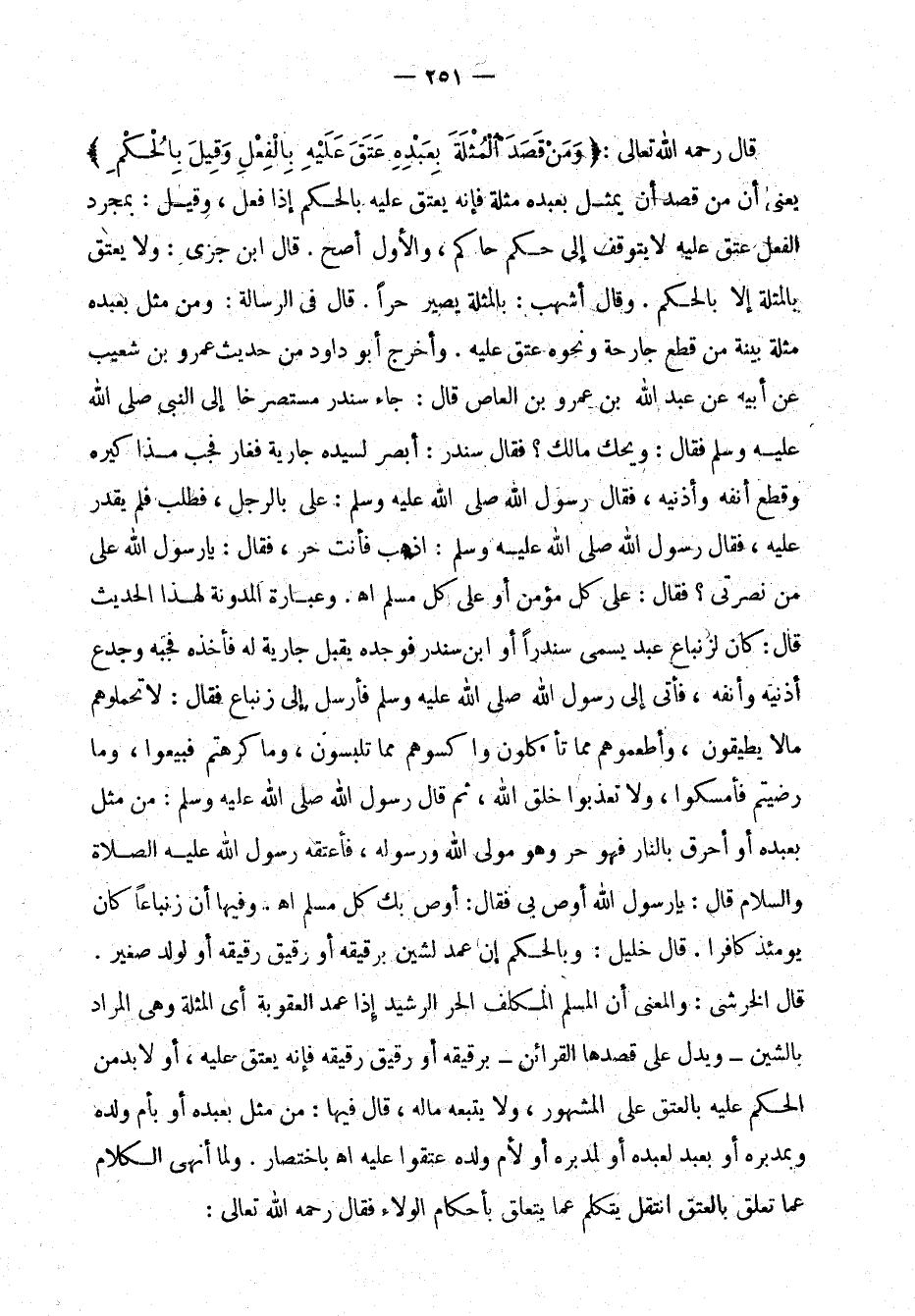قال رحمه اللَّه تعالى: "وَمَنْ قَصَدَ الْمُثْلَةَ بِعَبْدِهِ عَتَقَ عَلَيْهِ بِالْفِعْل وُقِيلّ بِاْحُكْم" يعني أن مَنْ قصد أن يمثَّل بعبده مُثْلَة فإنه يَعْتِقُ عليه بالحْكْم إذا فعل، وقيل: بمجرَّد الفعل عَتَقَ عليه لا يتوقف إلى حُكْمِ حاكم، والأول أصحُّ. قال ابن جزي: ولا يُعْتَقُ بالمُثْلة إلاَّ بالحْكْم. وقال أشهب: بالمُثْلة يصير حرًّا. قال في الرسالة: ومَنْ مثَّلَ بعبده مُثْلَة بيَّنة مِن قطع جارحة ونحوه عَتَقَ عليه. وأخرج أبو داود من حديث عمرو بن شعيب عن أبيه عن عبد اللَّه بن عمرو بن العاص قال: جاء سندر مستصرخًا إلى النبي صلى الله عليه وسلم فقال: ويْحضك ما لك؟ فقال سندر: أبصر لسيَّده جارية فغار فجبَّ مذاكريه وقَطَعَ أنفه وأذنَيْه، فقال رسول اللَّه صلى لله عليه وسلم "عليّ بالرجل"،لآ فطلب فلم يقدر عليه، فقال رسول الله صلى الله عليه وسلم: "اذهب فأنت حرُّ"، فقال: يا رسول اللذَه على من نصرتي؟ فقال: على كل مؤمن أو على كل مسلِم اهـ. وعبارة المدوَّنة لهذا الحديث قال: كان لزنباع عبد يسمّى سندرًا أو ابن سندر فوجده يقبَّل جارية له فأخذه فجَبَّه وجَدَعَ أذُنَيْه وأنْفَه، فأتى إلى رسول الله صلى الله عليه وسلم فأرسل إلىزنباع فقال: لا تحمَّلوهم ما لا يطيقون، وأطعموهم ممَّا تأكلون واكسوهم ممَّا تلبسون، وما كرهتم فبيعنوا، وما رضيتم فأمسكوا، ولا تعذَّبوا خَلْقَ اللَّه، ثم قال رسول اللَّه صلى الله عليه وسلم: "مَنْ مَثّل بعبده أو أحرق بالنار فهو حرٌّ وهو مولى الله ورسوله"، فأعتقه رسول الله صلى الله عليه الصلاة والسلام قال: يارسول الله أوصِ بي فقال: أوصي بك كل مسلِم اهـ. وفيها أن زنباعًا كان يومئذ كافرًا. قال خليل: وبالحكم إن عَمَدَ لشين برقيقه أو رقيق رقيقه أو لود صغير. قال الخرشي: والمعنى أن المسلِم المكلَّف الحرَّ الرشيد إذا عَمَدَ العقوبة أي المثلة وهي المراد بالشين - ويدلُّ على قصدها القرائن - برقيقة أو رقيق رقيقة فإنه يَعْتِقُ عليه، أو لا بدّ من الحكم عليه بالعَتْقِ على لمشهور، ولا يتبعه مالُهُ، قال فيها: مَنْ مثَّل بعبده أو بأمَّ ولده وبمدبره أو بعبد لعبده أو لمدبره أو لأمَّ ولده عتقوا عليه اهـ. باختصار. ولمَّا أنهى الكلامعلى ما تلَّق بالعَتْقِ انتقل يتكلم على ما يتعلَّق بأحكام الولاء فقال رحمه اللَّه تعالى: