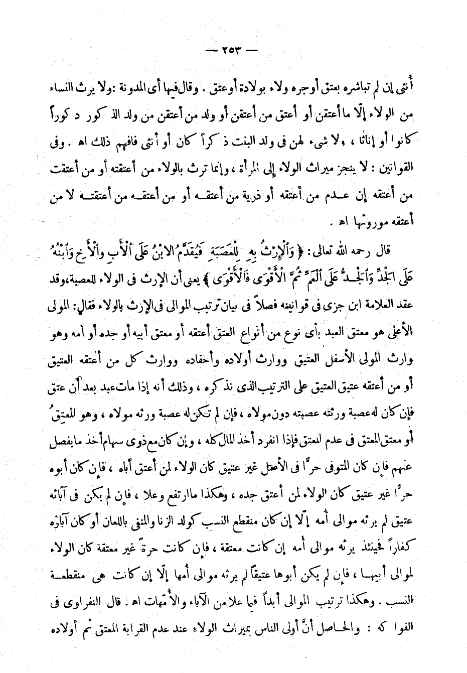 أُنثى إن لم تباشره بعَتْقٍ أو جرّه ولاء بولادة أو عتق. وقال فيها أي المدوَّنة: ولا يَرثُ النساء من الولاء إلاّ ما أعْتَقْنَ أو أعْتَقَ مَنْ أعْتَقْنَ أو ولد من أعْتَقْنَ من ولد الذكور ذكورًا كانوا أو إناثًا، ولا شيئ لهن في ولد البنت ذكراً كان أو أنثى فافْهَم ذلك اهـ. وفي القوانين: لا ينجز ميراث الولاء إلى المرأة، وإنَّما تَرِثُ بالولاء مَنْ أعْتَقَتْه أو مَنْ أعْتَقَتْ مَنْ أعْتَقَه إن عدم مَنْ أعْتَقَه أو ذرية مَنْ أعْتَقَه أو مَنْ أعْتَقَه مَنْ أعتَقَتْه لا مَنْ أعْتَقَه موروثها اهـ.