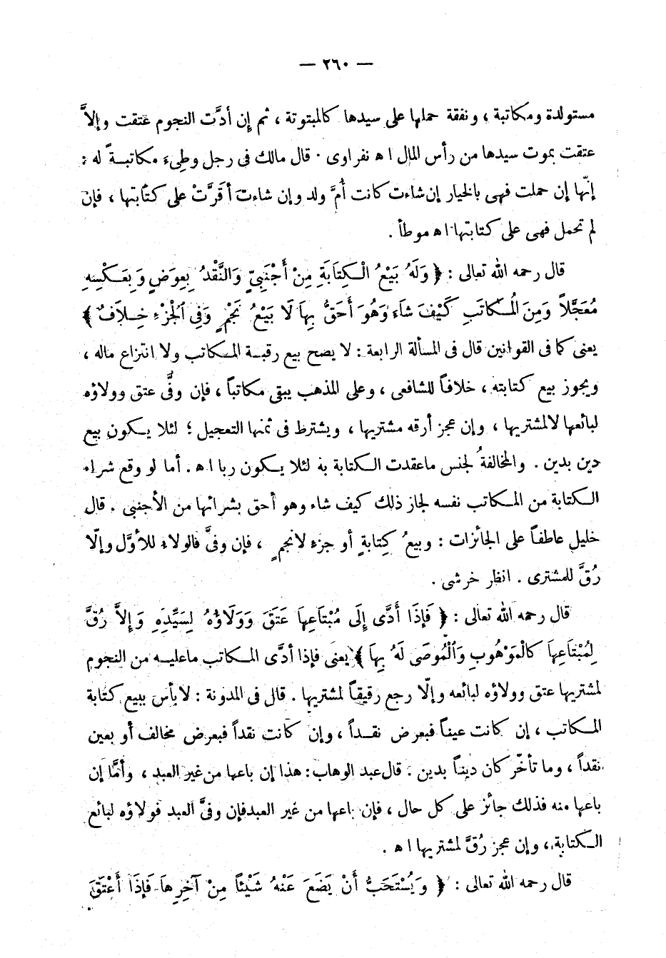 مستولدة ومكاتبة، ونفقة حملها على سيدها كالمبتوتة، ثم إن أدت النجوم عتقت وإلا عتقت بموت سيدها من رأس المال. اهـ. النفراوي. قال مالك في رجل وطئ مكاتبة له: إنها إن حملت فهي بالخيار إن شاءت كانت أم ولد وإن شاءت أقرت على كتابتها، فإن لم تحمل فهي على كتابتها. اهـ. الموطأ.