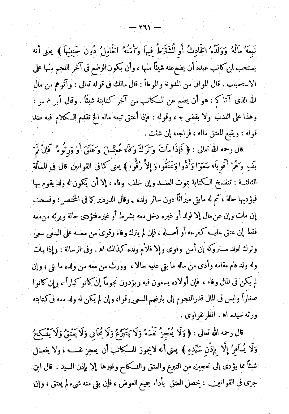 تبعه ماله وولده الحادث أو المشترط فيها وأمته الحامل دون جنينها)، يعني أنه يستحب لمن كاتب عبده أن يضع عنه شيئًا منها، وأن يكون الوضع في آخر النجم منها على الاستحباب. قال المواق من المدونة والموطأ: قال مالك في قوله تعالى: {وآتوهم من مال الله الذي أتاكم} [النور: 33]: هو أن يضع عن المكاتب من آخر كتابته شيئًا. وقال أبو عمر: وهذا على الندب ولا يُقضى به، وقوله: فإذا أعتق تبعه ماله ... إلخ تقدم الكلام فيه عند قوله: ويتبع المعتق ماله، فراجعه إن شئت.