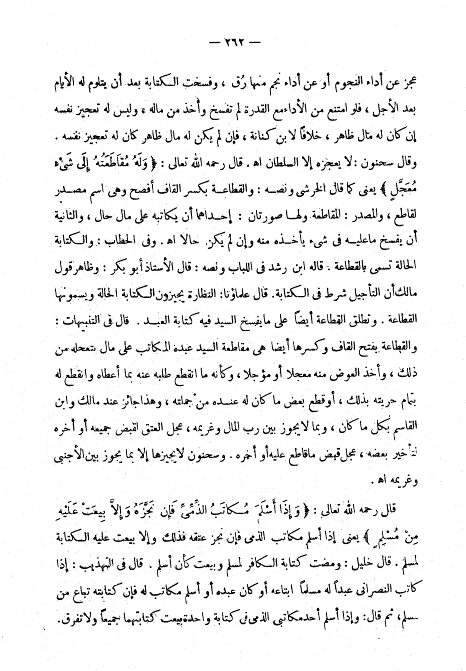 عجز عن أداء النجوم أو عن أداء نجم منها رُق، وفسخت الكتابة بعد أن يتلوم له الأيام بعد الأجل، فلو امتنع من الأداء مع القدرة لم تفسخ وأخذ من ماله، وليس له تعجيز نفسه إن كان له ماله ظاهر، خلافًا لابن كنانة، فإن لم يكن له مال ظاهر كان له تعجيز نفسه. وقال سحنون: لا يعجزه إلا السلطان. اهـ. قال رحمه الله تعالى: (وله مقاطعته إلى شيء معجل)، يعني كما قال الخرشي ونصه: والقطاعة بسكر القاف أفصح، وهي اسم مصدر لقاطع، والمصدر: المقاطعة، ولها صورتان: إحداهما: أن يكاتبه على مال حال. والثانية: أن يفسخ ما عليه في شيء يأخذه منه وإن لم يكن حالاً. اهـ. وفي الحطاب: والكتابة الحالة تسمى بالقطاعة. قاله ابن رشد في اللباب ونصه: قال الأستاذ أبو بكر: وظاهر قول مالك أن التأجيل شرط في الكتابة. قال علماؤنا: النظارة يجيزون الكتابة الحالة ويسمونها القطاعة. وتطلق القطاعة أيضًا على ما يفسخ السيد في كتابة العبد. قال في التنبيهات: والقطاعة بفتح القاف وكسرها أيضًا هي مقاطعة السيد عبده المكاتب على مال بتعجله من ذلك، وأخذ العوض منه معجلاً أو مؤجلاً، وكأنه ما انقطع طلبه عنه بما أعطاه وانقطع له بتمام حريته بذلك، أو قطع بعض ما كان له عنده من جملته، وهذا جائز عند مالك وابن القاسم بكل ما كان، وبما لا يجوز بين رب المال وغريمه، عجل العتق لقبض جميعه أو أخره لتأخير بعضه، عجل قبض ما قاطع عليه أو أخره، وسحنون لا يجيزها إلا بما يجوز بين الأجنبي وغريمه. اهـ.