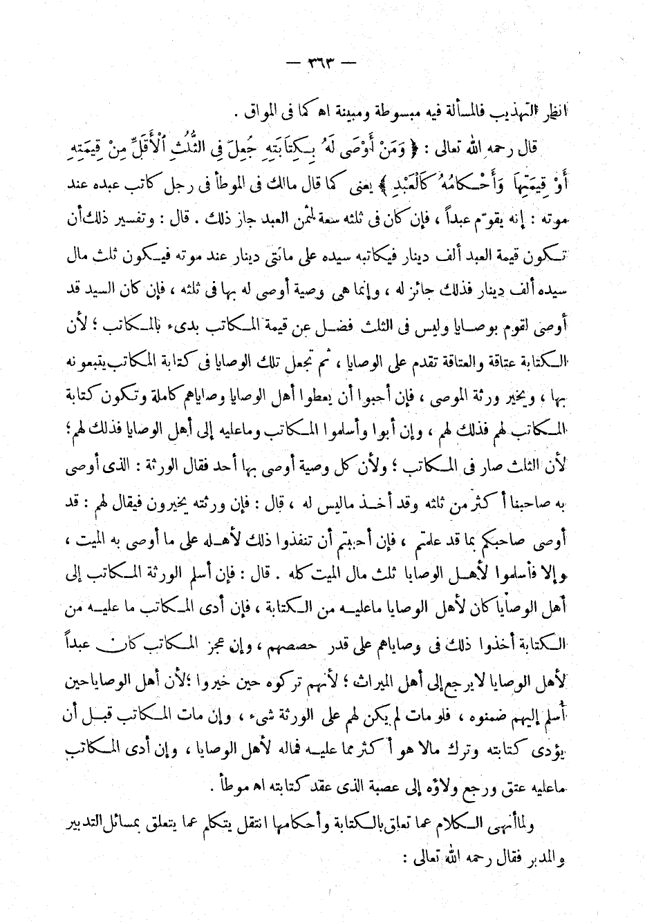 ثلثه، فإن كان السيد قد أوصى لقوم بوصايا وليس في الثلث فضل عن قيمة المكاتب بدئ بالمكاتب؛ لأن الكتابة عتاقة، والعتاقة تقدم على الوصايا، ثم تجعل تلك الوصايا في كتابة المكاتب يتبعونه بها، ويخير ورثة الموصي، فإن أحبوا أن يعطوا أهل الوصايا وصاياهم كاملة وتكون كتابة المكاتب لهم فذلك لهم، وإن أبوا وأسلموا المكاتب وما عليه إلى أهل الوصايا فذلك لهم؛ لأن الثلث صار في المكاتب، ولأن كل وصية أوصى بها أحد فقال الورثة: الذي أوصى به صاحبنا أكثر من ثلثه وقد أخذ ما ليس له، فقال: فإن ورثته يخيرون فيقال لهم: قد أوصى صاحبكم بما قد علمتم، فإن أحببتم أن تنفذوا ذلك لأهله على ما أوصى به الميت، وإلا فأسلموا لأهل الوصايا ثلث مال الميت كله. قال: فإن أسلم الورثة المكاتب إلى أهل الوصايا كان لأهل الوصايا ما عليه من الكتابة، فإن أدى المكاتب ما عليه من الكتابة أخذوا ذلك في وصاياهم على قدر حصصهم، وإن عجز المكاتب كان عبدًا لأهل الوصايا لا يرجع إلى أهل الميراث؛ لأنهم تركوه حين خيروا؛ لأن أهل الوصايا حين أسلم إليهم ضمنوه، فلو مات لم يكن لهم على الورثة شيء، وإن مات المكاتب قبل أن يؤدي كتابته وترك مالاً هو أكثر مما عليه فماله لأهل الوصايا، وإن أدى المكاتب ما عليه عتق ورجع ولاؤه إلى عصبة الذي عقد كتابته. اهـ. الموطأ.