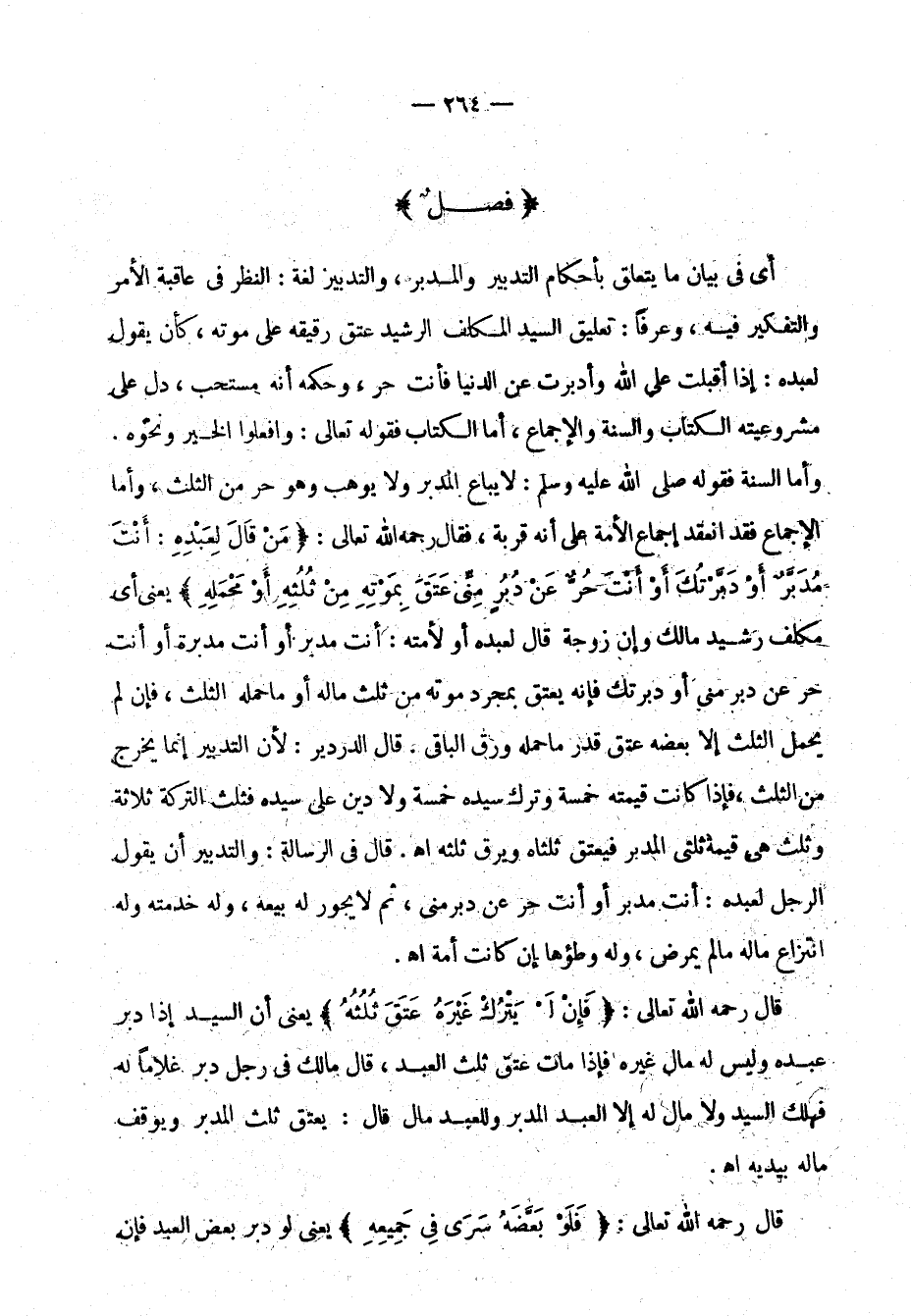 أي في بيان ما يتعلق بأحكام التدبير والمدبر، والتدبير لغة: النظر في عاقبة الأمر والتفكير فيه، وعرفًا: تعليق السيد المكلف الرشيد عتق رقيقه على موته، كأن يقول لعبده: إذا أقبلت على الله وأدبرت عن الدنيا فأنت حر، وحكمه أنه مستحب، دل على مشروعيته الكتاب والسنة والإجماع، أما الكتاب فقوله تعالى: {وافعلوا الخير} [الحج: 77] ونحوه، وأما السنة فقوله صلى الله عليه وسلم: ((لا يباع المدبر ولا يوهب وهو حر من الثلث))، وأما الإجماع فقد انعقد إجماع الأمة على أنه قربة، فقال رحمه الله تعالى: (من قال لعبده: أنت مدبر أو دبرتك أو أنت حر عن دبر مني عتق بموته من ثلثه أو محمله)، يعني أي مكلف رشيد مالك وإن زوجة قال لعبده أو لأمته: أنت مدبر أو أنت حر عن دبر مني أو دبرتك فإنه يعتق بمجرد موته من ثلث ماله أو ما حمله الثلث، فإن لم يحمل الثلث إلا بعضه عتق قدر ما حمله ورق الباقي. قال الدردير: لأن التدبير إنما يخرج من الثلث، فإذا كانت قيمته