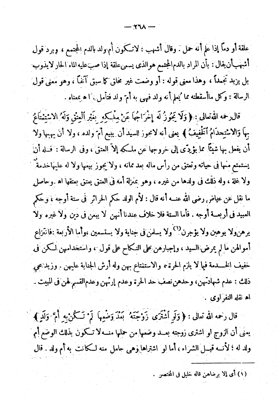 قال رحمه الله تعالى: (ولا يجوز له إخراجها عن ملكه بغير العتق وله الاستمتاع بها والاستخدام الخفيف)، يعني أنه لا يجوز للسيد أن يبيع أم ولده، ولا أن يهبها ولا أن يفعل بها شيئًا مما يؤدي إلى خروجها عن ملكه إلا العتق، وفي الرسالة: فله أن يستمتع منها في حياته وتعتق من رأس ماله بعد مماته، ولا يجوز بيعها ولا له عليها خدمة ولا غلة، وله ذلك في ولدها من غيره، وهو بمنزلة أمه في العتق يعتق بعتقها. اهـ. وحاصل ما نقل عن عياض، رضي الله عنه، أنه قال: لأم الولد حكم الحرائر في ستة أوجه، وحكم العبيد في أربعة أوجه. فأما الستة فلا خلاف عندنا أنهن لا يبعن في دين ولا غيره ولا يرهن ولا يوهبن ولا يؤجرن (¬1) ولا يسلمن في جناية ولا يستسعين، وأما الأربعة: فانتزاع أموالهن ما لم يمرض